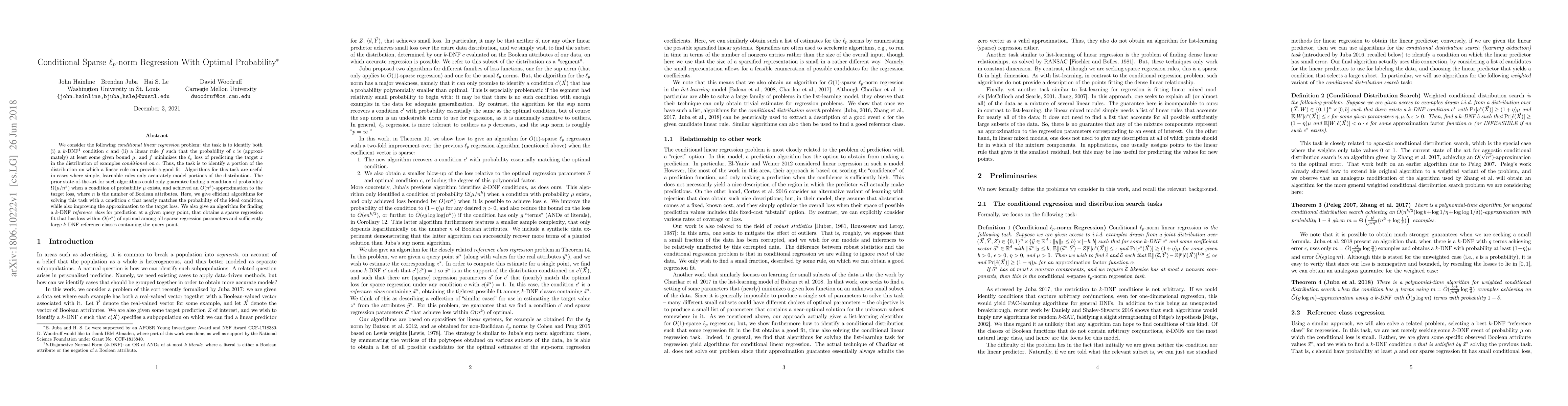 This paper proposes efficient algorithms for conditional sparse $\ell_p$-norm regression, identifying a $k$-DNF condition and a linear rule that fit a portion of the data distribution with high probability and minimal $\ell_p$ loss. The new algorithms nearly match the probability of the ideal condition and improve the approximation to the target loss compared to prior methods.