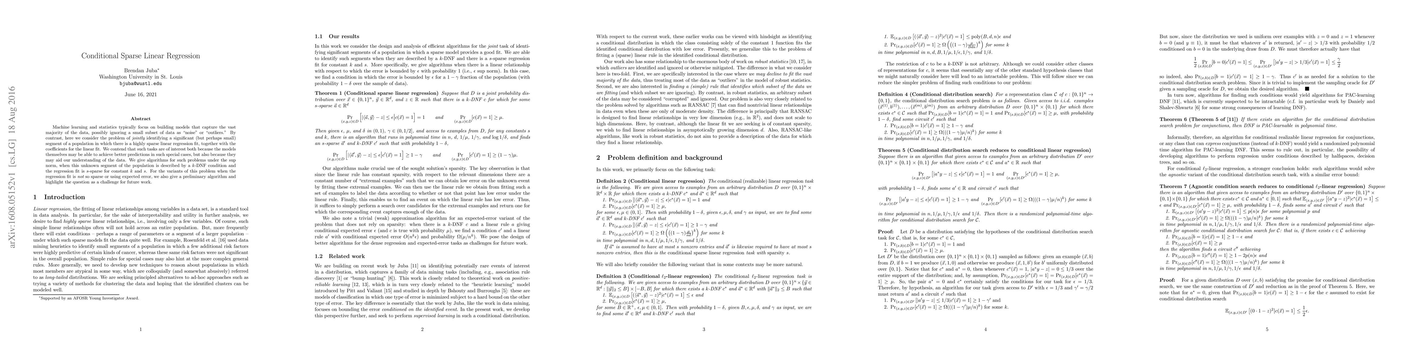 Machine learning and statistics typically focus on building models that capture the vast majority of the data, possibly ignoring a small subset of data as "noise" or "outliers." By contrast, here we consider the problem of jointly identifying a significant (but perhaps small) segment of a population in which there is a highly sparse linear regression fit, together with the coefficients for the linear fit. We contend that such tasks are of interest both because the models themselves may be able to achieve better predictions in such special cases, but also because they may aid our understanding of the data. We give algorithms for such problems under the sup norm, when this unknown segment of the population is described by a k-DNF condition and the regression fit is s-sparse for constant k and s. For the variants of this problem when the regression fit is not so sparse or using expected error, we also give a preliminary algorithm and highlight the question as a challenge for future work.