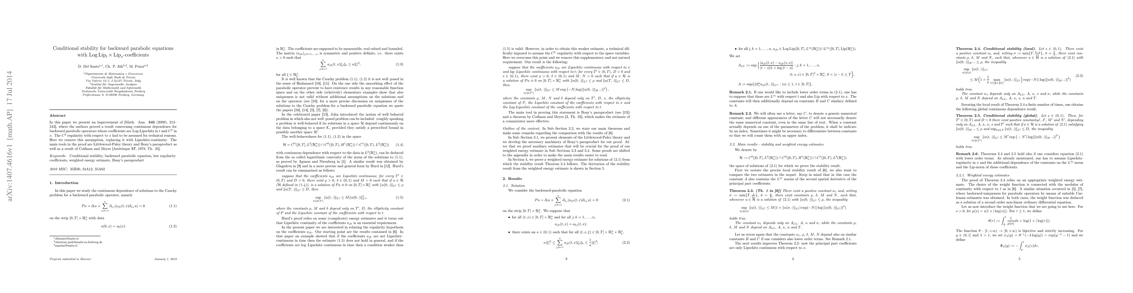 This paper improves upon a previous result by removing the assumption of C^2 regularity in x for backward parabolic operators with Log-Lip coefficients, instead using Lipsitz-continuity, and applies Littlewood-Paley theory and Bony's paraproduct to prove conditional stability.