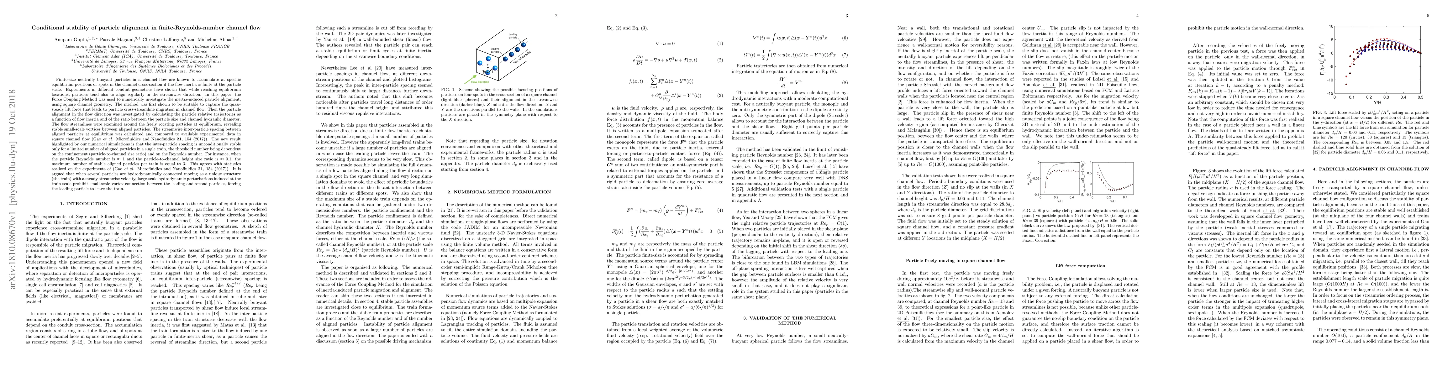 Researchers studied particle alignment in channel flow using numerical simulations, finding that alignment is stable only for a limited number of particles in a single train, depending on the confinement ratio and Reynolds number.