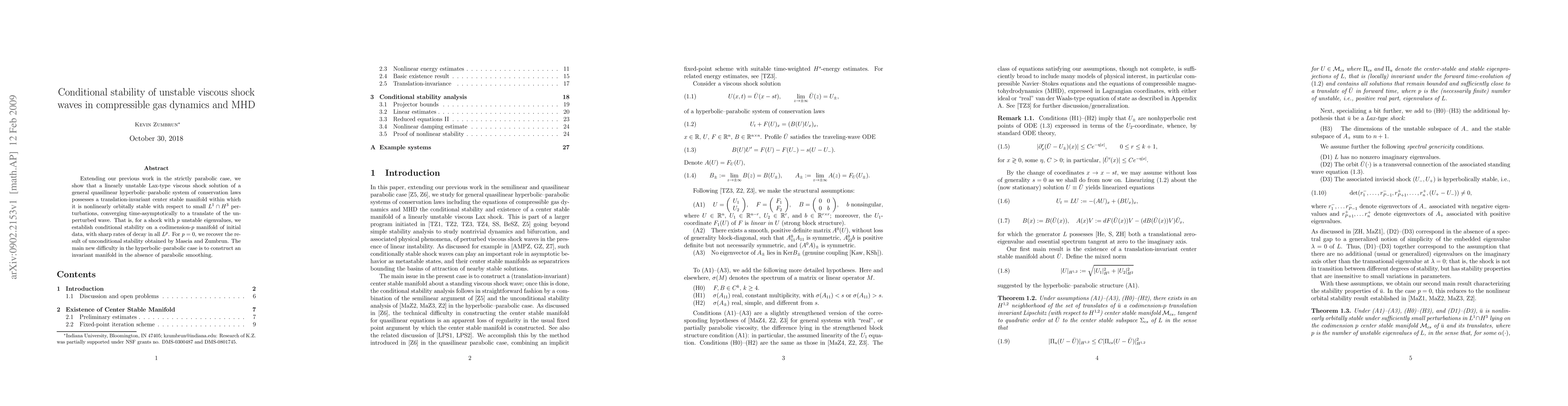 This paper demonstrates conditional stability for unstable viscous shock waves in compressible gas dynamics and magnetohydrodynamics (MHD). It establishes a translation-invariant center stable manifold where the shock remains nonlinearly orbitally stable under small perturbations, converging to the unperturbed wave, with sharp decay rates.