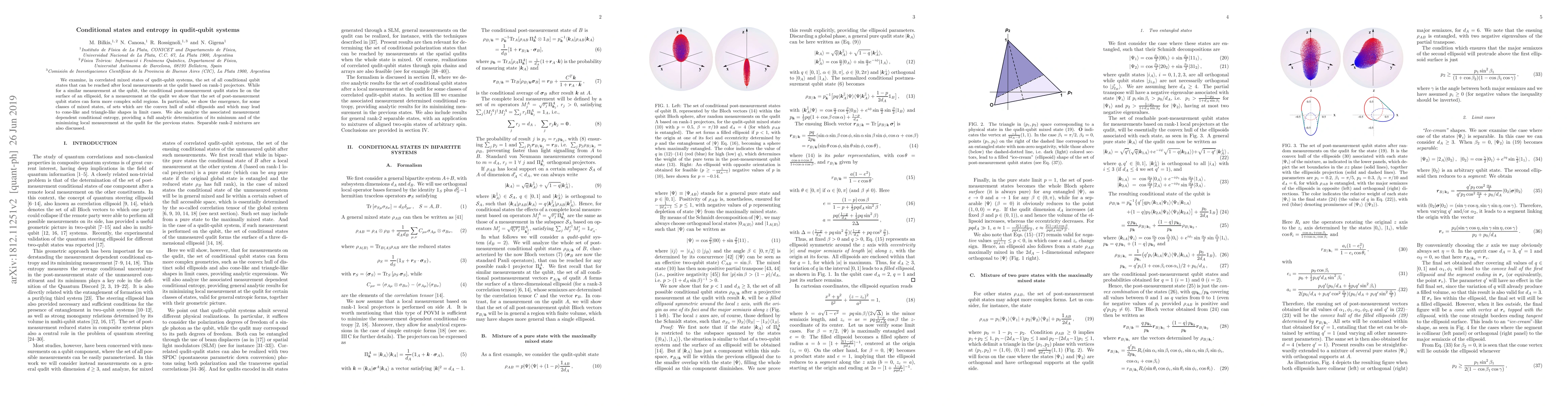 This paper investigates conditional states in mixed qudit-qubit systems after local measurements, revealing that post-measurement qubit states can form complex solid regions, including cone-like and triangle-like shapes. It also analyzes measurement-dependent conditional entropy, determining its minimum and the optimal local measurement for minimizing entropy.