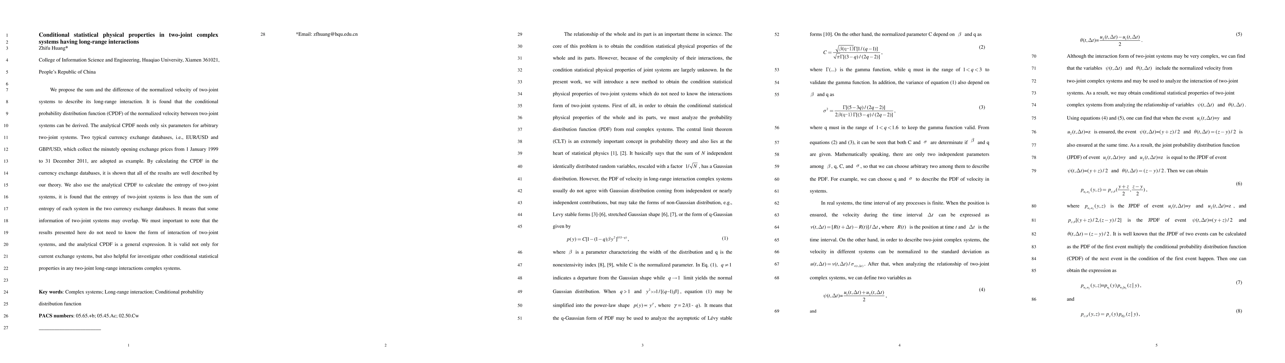 We propose the sum and the difference of the normalized velocity of two-joint systems to describe its long-range interaction. It is found that the conditional probability distribution function (CPDF) of the normalized velocity between two-joint systems can be derived. The analytical CPDF needs only six parameters for arbitrary two-joint systems. Two typical currency exchange databases, i.e., EUR/USD and GBP/USD, which collect the minutely opening exchange prices from 1 January 1999 to 31 December 2011, are adopted as example. By calculating the CPDF in the currency exchange databases, it is shown that all of the results are well described by our theory. We also use the analytical CPDF to calculate the entropy of two-joint systems, it is found that the entropy of two-joint systems is less than the sum of entropy of each system in the two currency exchange databases. It means that some information of two-joint systems may overlap. We must important to note that the results presented here do not need to know the form of interaction of two-joint systems, and the analytical CPDF is a general expression. It is valid not only for current exchange systems, but also helpful for investigate other conditional statistical properties in any two-joint long-range interactions complex systems.
