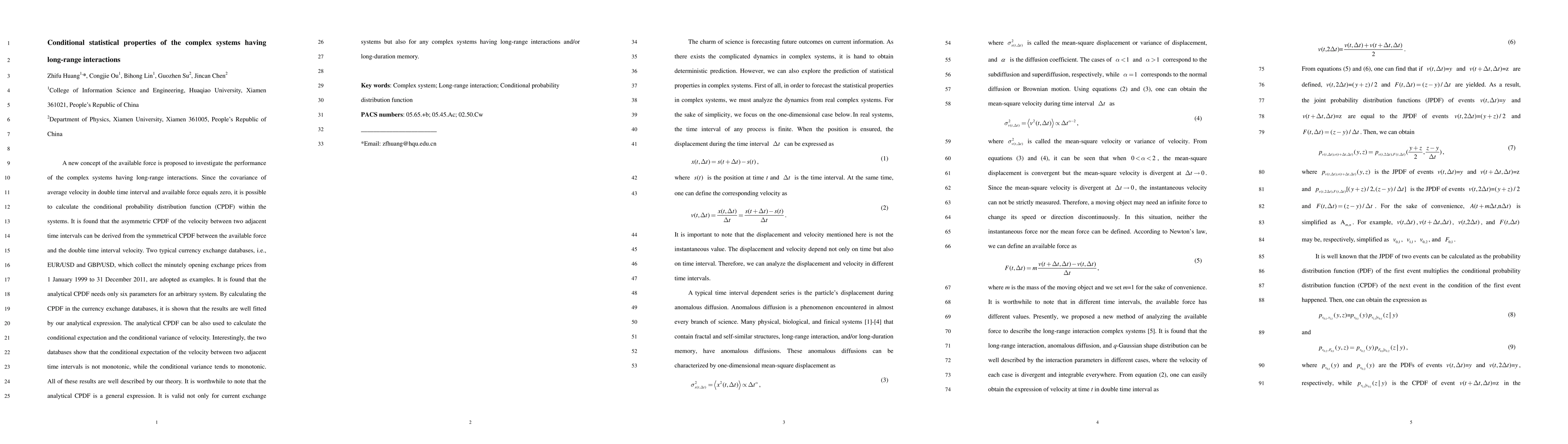 A new concept of the available force is proposed to investigate the performance of the complex systems having long-range interactions. Since the covariance of average velocity in double time interval and available force equals zero, it is possible to calculate the conditional probability distribution function (CPDF) within the systems. It is found that the asymmetric CPDF of the velocity between two adjacent time intervals can be derived from the symmetrical CPDF between the available force and the double time interval velocity. Two typical currency exchange databases, i.e., EUR/USD and GBP/USD, which collect the minutely opening exchange prices from 1 January 1999 to 31 December 2011, are adopted as examples. It is found that the analytical CPDF needs only six parameters for an arbitrary system. By calculating the CPDF in the currency exchange databases, it is shown that the results are well fitted by our analytical expression. The analytical CPDF can be also used to calculate the conditional expectation and the conditional variance of velocity. Interestingly, the two databases show that the conditional expectation of the velocity between two adjacent time intervals is not monotonic, while the conditional variance tends to monotonic. All of these results are well described by our theory. It is worthwhile to note that the analytical CPDF is a general expression. It is valid not only for current exchange systems but also for any complex systems having long-range interactions and/or long-duration memory.