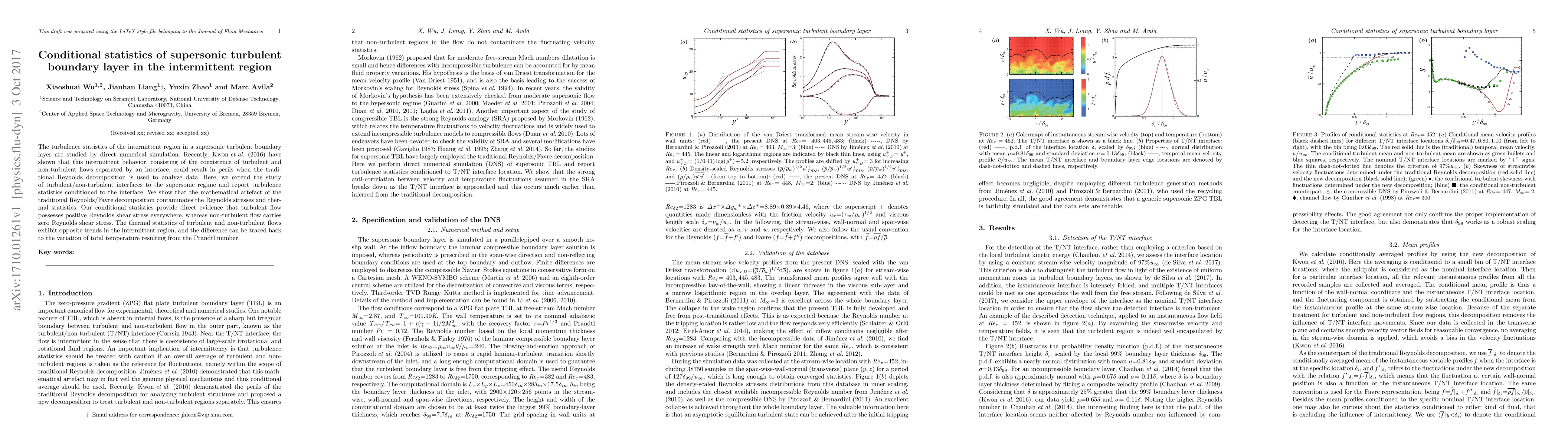 This paper investigates the turbulence statistics in the intermittent region of a supersonic turbulent boundary layer via direct numerical simulation, revealing the contamination of traditional decomposition methods. Conditional statistics show that turbulent flows have positive Reynolds shear stress, while non-turbulent flows have zero, and thermal statistics differ due to total temperature variations influenced by the Prandtl number.