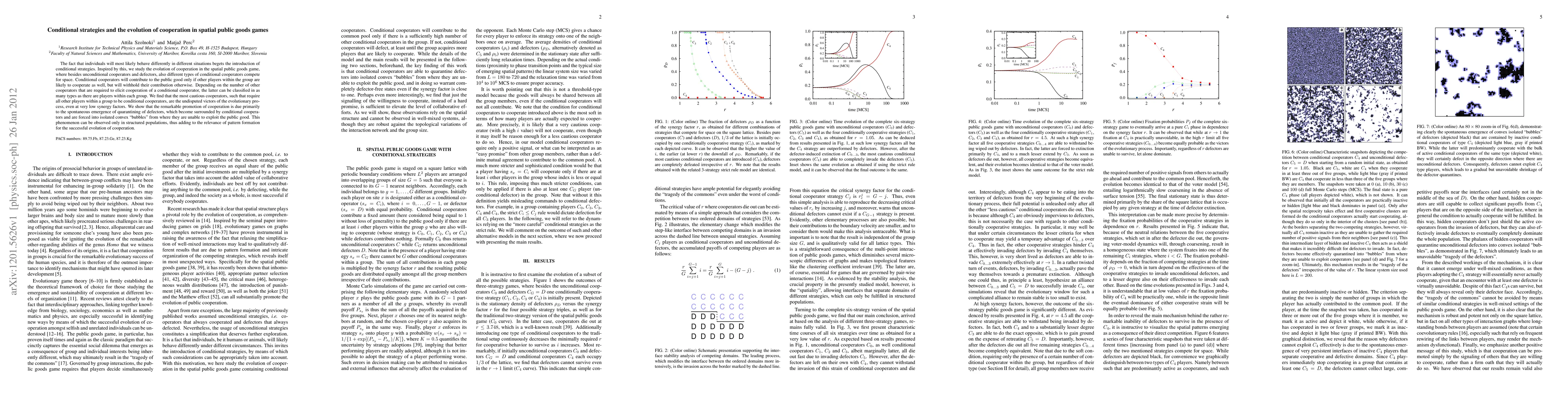 This paper investigates how conditional strategies enhance cooperation in spatial public goods games, finding that the most cautious conditional cooperators, who require all group members to cooperate, dominate the evolutionary process. The key mechanism promoting cooperation is the spontaneous emergence of "bubbles" isolating defectors, facilitated by structured populations.