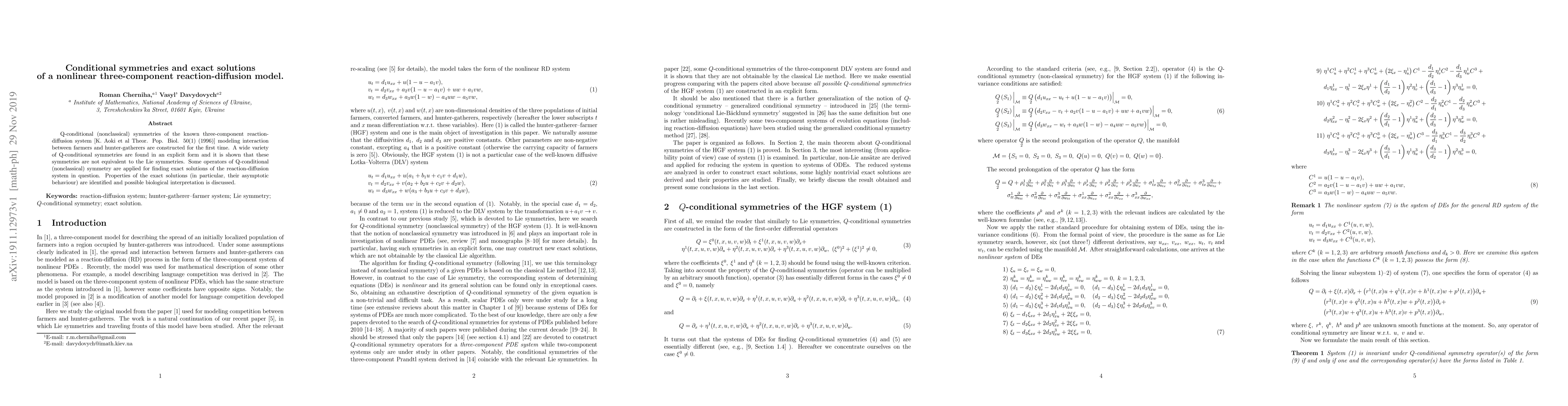 Q-conditional (nonclassical) symmetries of the known three-component reaction-diffusion system [K. Aoki et al Theor. Pop. Biol. 50(1) (1996)] modeling interaction between farmers and hunter-gatherers are constructed for the first time. A wide variety of Q-conditional symmetries are found in an explicit form and it is shown that these symmetries are not equivalent to the Lie symmetries. Some operators of Q-conditional (nonclassical) symmetry are applied for finding exact solutions of the reaction-diffusion system in question. Properties of the exact solutions (in particular, their asymptotic behaviour) are identified and possible biological interpretation is discussed.