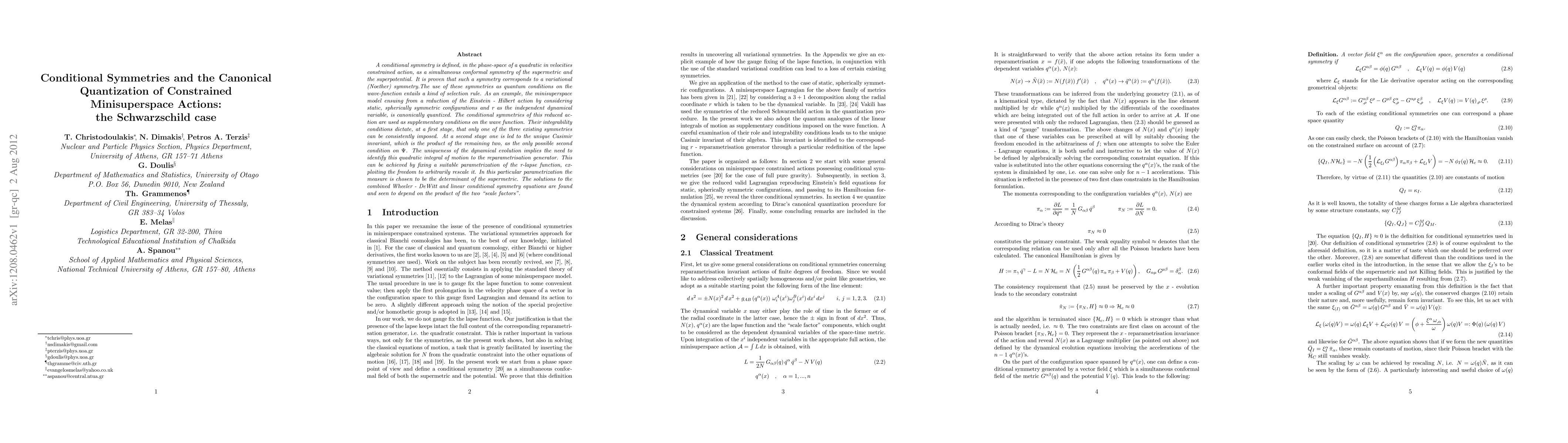 A conditional symmetry is defined, in the phase-space of a quadratic in velocities constrained action, as a simultaneous conformal symmetry of the supermetric and the superpotential. It is proven that such a symmetry corresponds to a variational (Noether) symmetry.The use of these symmetries as quantum conditions on the wave-function entails a kind of selection rule. As an example, the minisuperspace model ensuing from a reduction of the Einstein - Hilbert action by considering static, spherically symmetric configurations and r as the independent dynamical variable, is canonically quantized. The conditional symmetries of this reduced action are used as supplementary conditions on the wave function. Their integrability conditions dictate, at a first stage, that only one of the three existing symmetries can be consistently imposed. At a second stage one is led to the unique Casimir invariant, which is the product of the remaining two, as the only possible second condition on $\Psi$. The uniqueness of the dynamical evolution implies the need to identify this quadratic integral of motion to the reparametrisation generator. This can be achieved by fixing a suitable parametrization of the r-lapse function, exploiting the freedom to arbitrarily rescale it. In this particular parametrization the measure is chosen to be the determinant of the supermetric. The solutions to the combined Wheeler - DeWitt and linear conditional symmetry equations are found and seen to depend on the product of the two "scale factors"