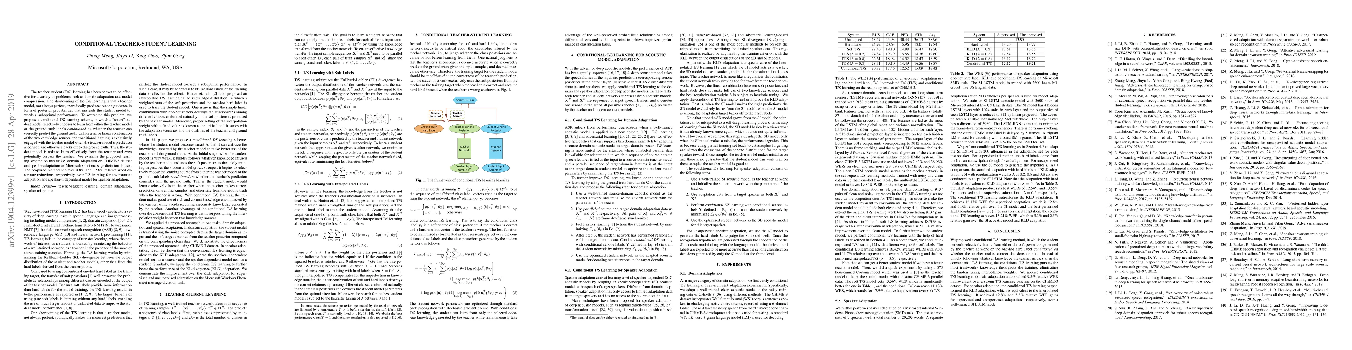 This paper proposes a conditional teacher-student learning scheme that allows the student model to selectively learn from either the teacher model or ground truth, depending on the teacher's accuracy. The method achieves significant reductions in word error rates for domain and speaker adaptation tasks.