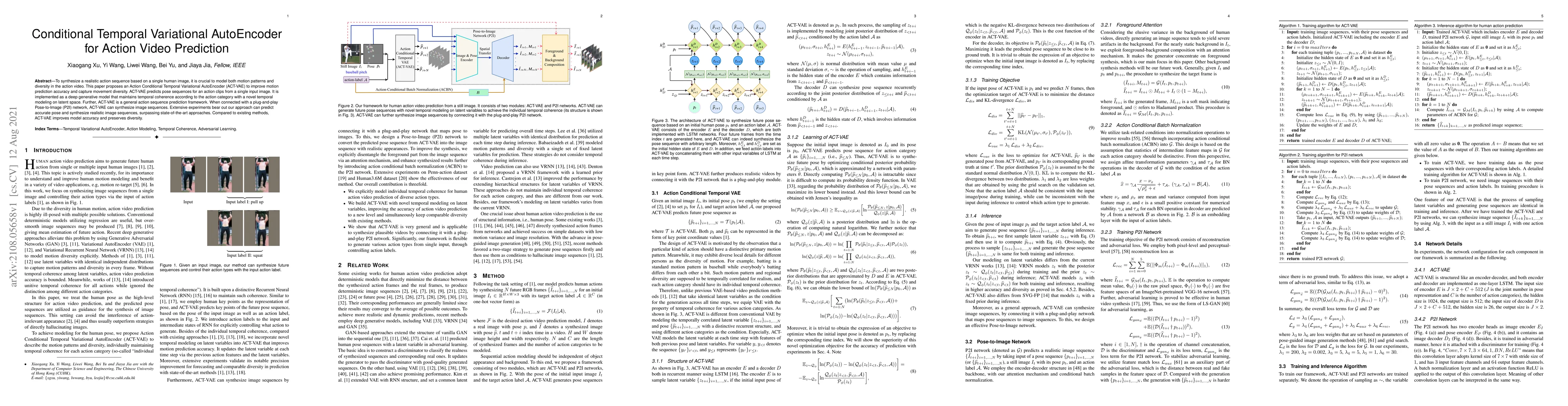 This paper introduces the Action Conditional Temporal Variational AutoEncoder (ACT-VAE) to predict accurate pose sequences and synthesize realistic action video sequences from a single input image. ACT-VAE enhances motion prediction and captures movement diversity through temporal coherence modeling, outperforming existing methods.