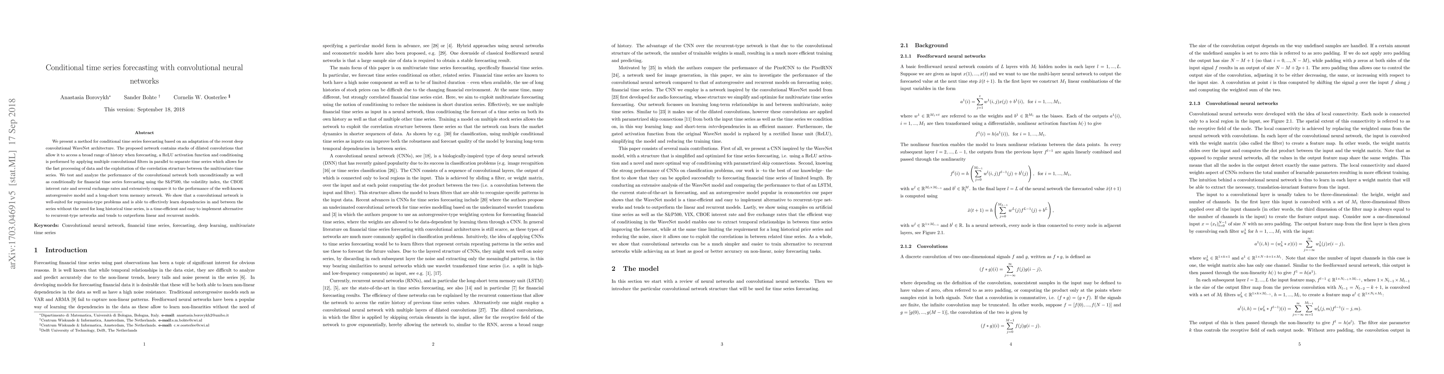 This paper proposes a convolutional neural network based on the WaveNet architecture for conditional time series forecasting, demonstrating its effectiveness for financial data and comparing it favorably to autoregressive models and LSTM networks. The network uses dilated convolutions and parallel filters for efficient processing and correlation exploitation.