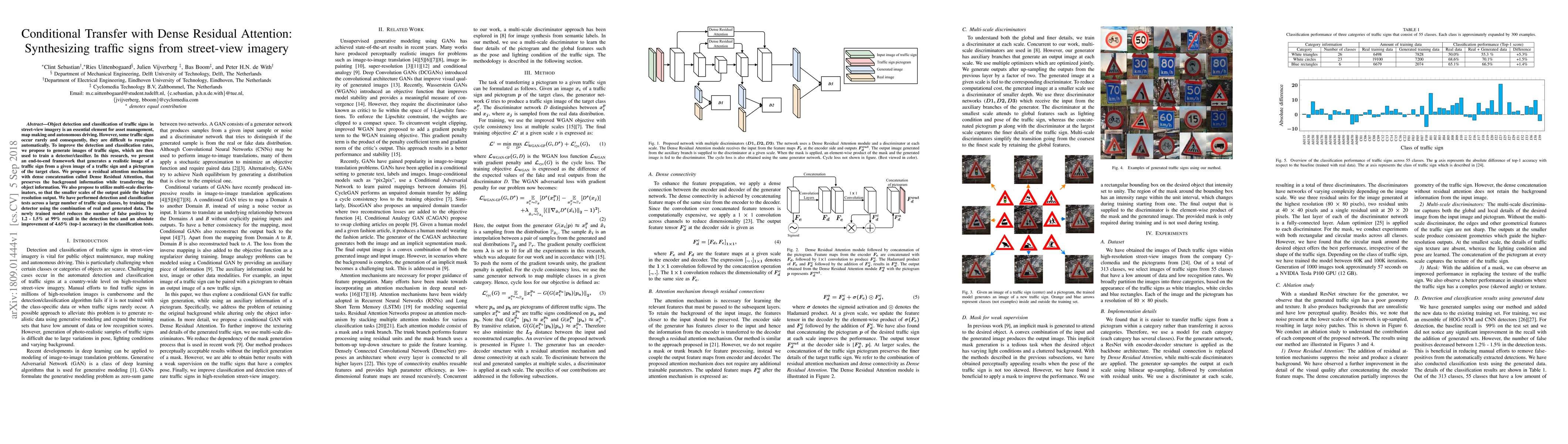 This paper proposes an end-to-end framework for generating realistic traffic sign images from street-view imagery using a Dense Residual Attention mechanism, which enhances detection and classification rates. The approach combines real and synthetic data to reduce false positives by 1.2-1.5% and improve classification accuracy by 4.65%.
