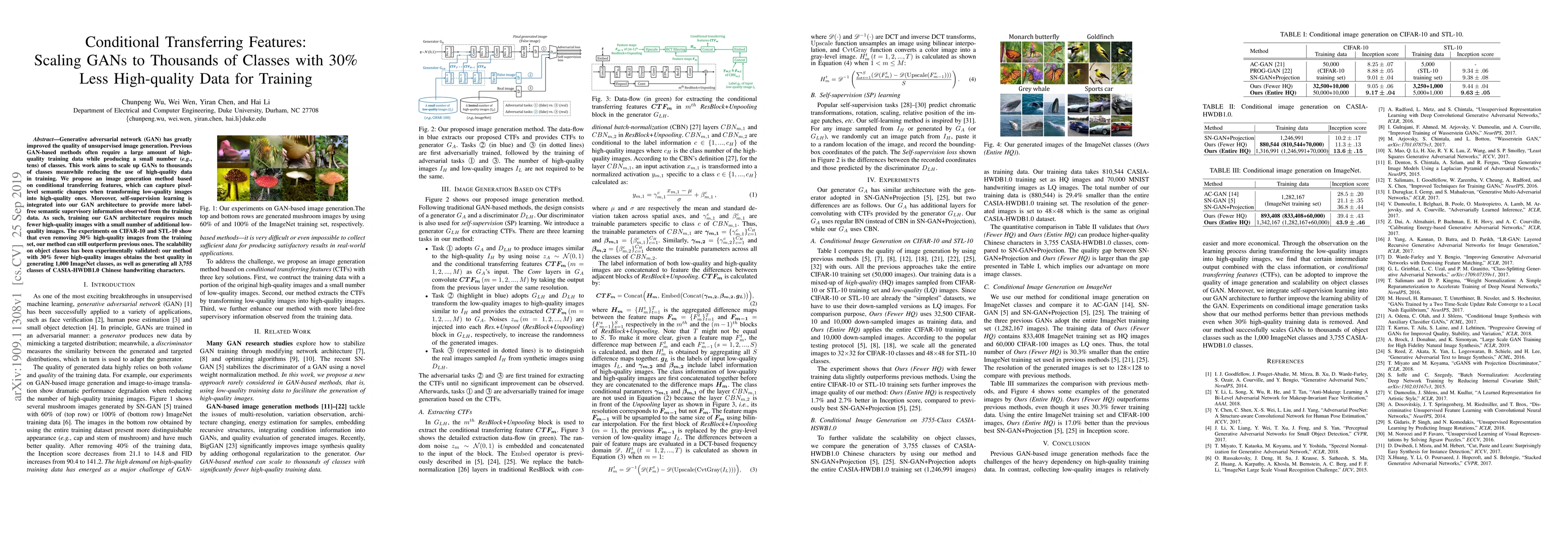 Generative adversarial network (GAN) has greatly improved the quality of unsupervised image generation. Previous GAN-based methods often require a large amount of high-quality training data while producing a small number (e.g., tens) of classes. This work aims to scale up GANs to thousands of classes meanwhile reducing the use of high-quality data in training. We propose an image generation method based on conditional transferring features, which can capture pixel-level semantic changes when transforming low-quality images into high-quality ones. Moreover, self-supervision learning is integrated into our GAN architecture to provide more label-free semantic supervisory information observed from the training data. As such, training our GAN architecture requires much fewer high-quality images with a small number of additional low-quality images. The experiments on CIFAR-10 and STL-10 show that even removing 30% high-quality images from the training set, our method can still outperform previous ones. The scalability on object classes has been experimentally validated: our method with 30% fewer high-quality images obtains the best quality in generating 1,000 ImageNet classes, as well as generating all 3,755 classes of CASIA-HWDB1.0 Chinese handwriting characters.