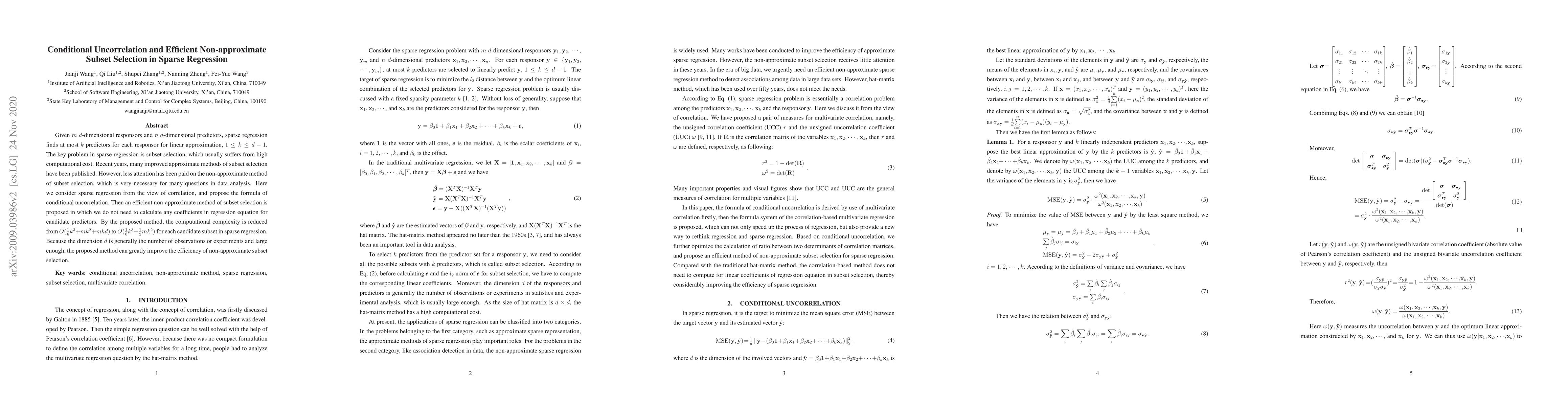 Given $m$ $d$-dimensional responsors and $n$ $d$-dimensional predictors, sparse regression finds at most $k$ predictors for each responsor for linear approximation, $1\leq k \leq d-1$. The key problem in sparse regression is subset selection, which usually suffers from high computational cost. Recent years, many improved approximate methods of subset selection have been published. However, less attention has been paid on the non-approximate method of subset selection, which is very necessary for many questions in data analysis. Here we consider sparse regression from the view of correlation, and propose the formula of conditional uncorrelation. Then an efficient non-approximate method of subset selection is proposed in which we do not need to calculate any coefficients in regression equation for candidate predictors. By the proposed method, the computational complexity is reduced from $O(\frac{1}{6}{k^3}+mk^2+mkd)$ to $O(\frac{1}{6}{k^3}+\frac{1}{2}mk^2)$ for each candidate subset in sparse regression. Because the dimension $d$ is generally the number of observations or experiments and large enough, the proposed method can greatly improve the efficiency of non-approximate subset selection.