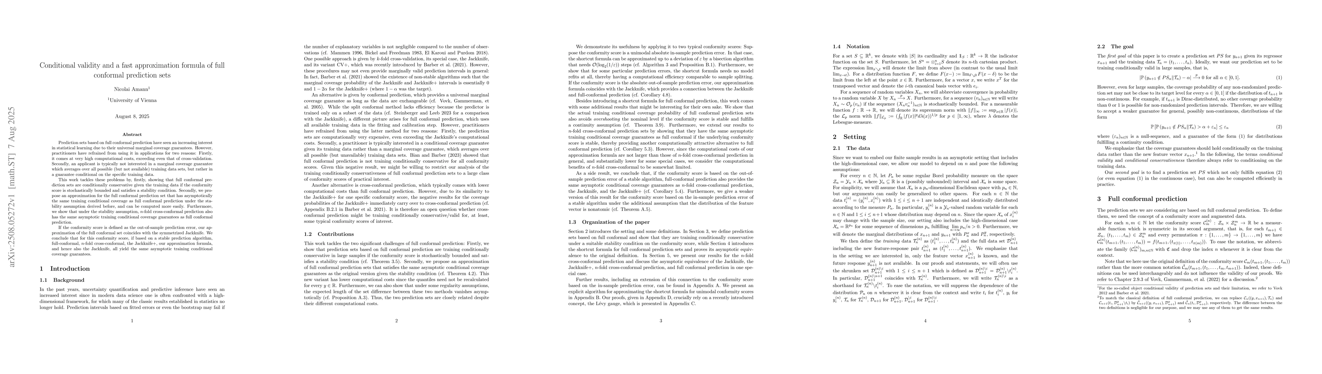 The paper introduces a fast approximation formula for full conformal prediction sets, ensuring conditional coverage guarantees while reducing computational costs significantly.