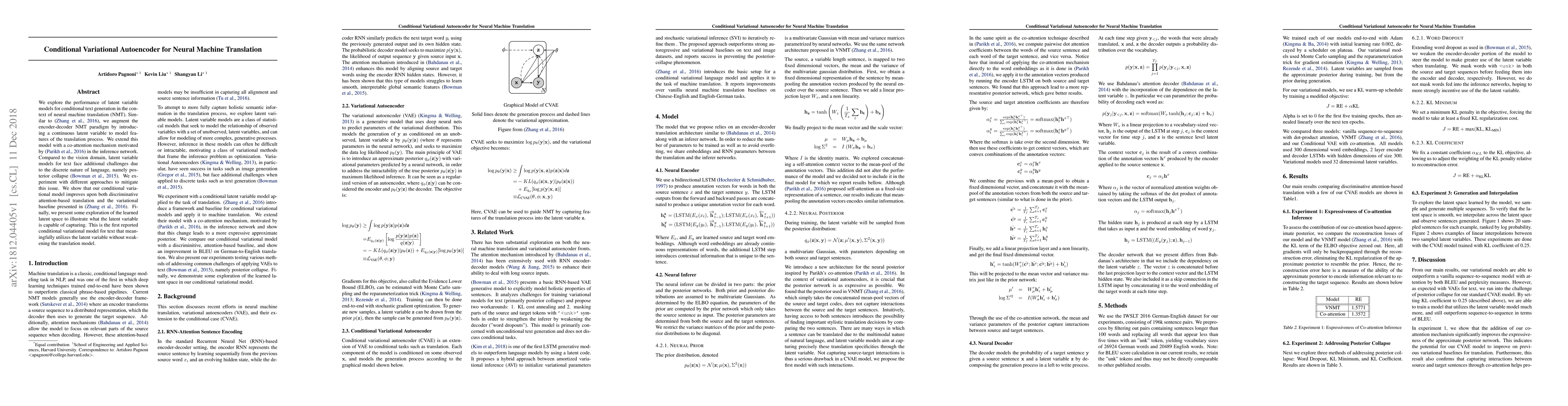 This paper proposes a conditional variational autoencoder for neural machine translation, incorporating a continuous latent variable to enhance the encoder-decoder framework. The model addresses posterior collapse in text through various mitigation strategies and demonstrates superior performance compared to traditional attention-based and variational baselines.