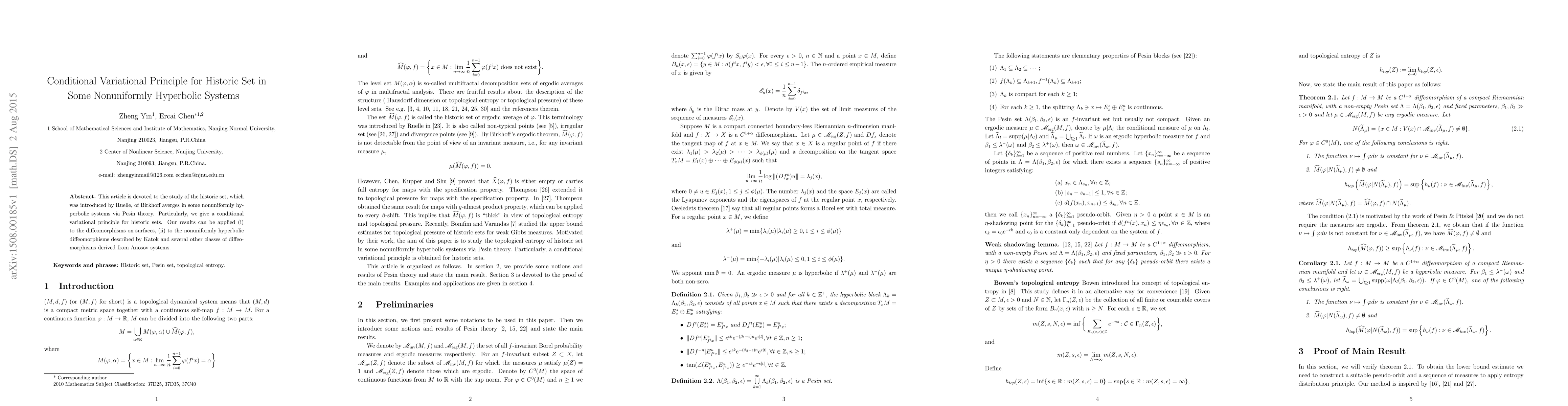 This paper explores the historic set and its Birkhoff averages in nonuniformly hyperbolic systems using Pesin theory, establishing a conditional variational principle. The findings apply to various classes of diffeomorphisms, including those on surfaces and those derived from Anosov systems.