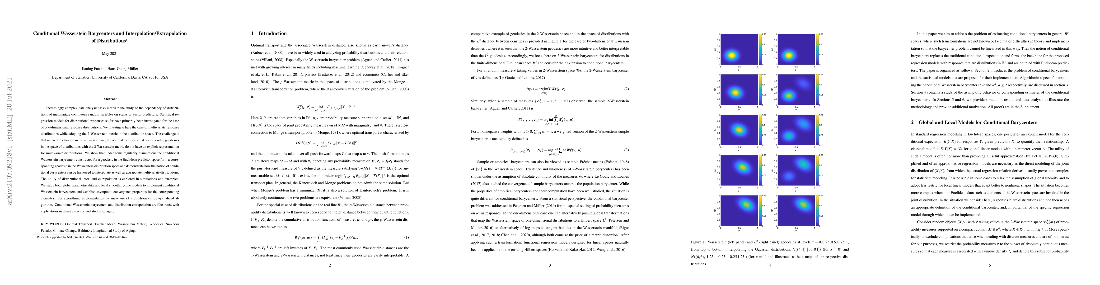 This paper explores the computation of conditional Wasserstein barycenters for multivariate response distributions using the 2-Wasserstein metric, addressing the lack of explicit optimal transport solutions. It demonstrates their utility in interpolating and extrapolating distributions, supported by simulations and applications in climate science and aging studies.
