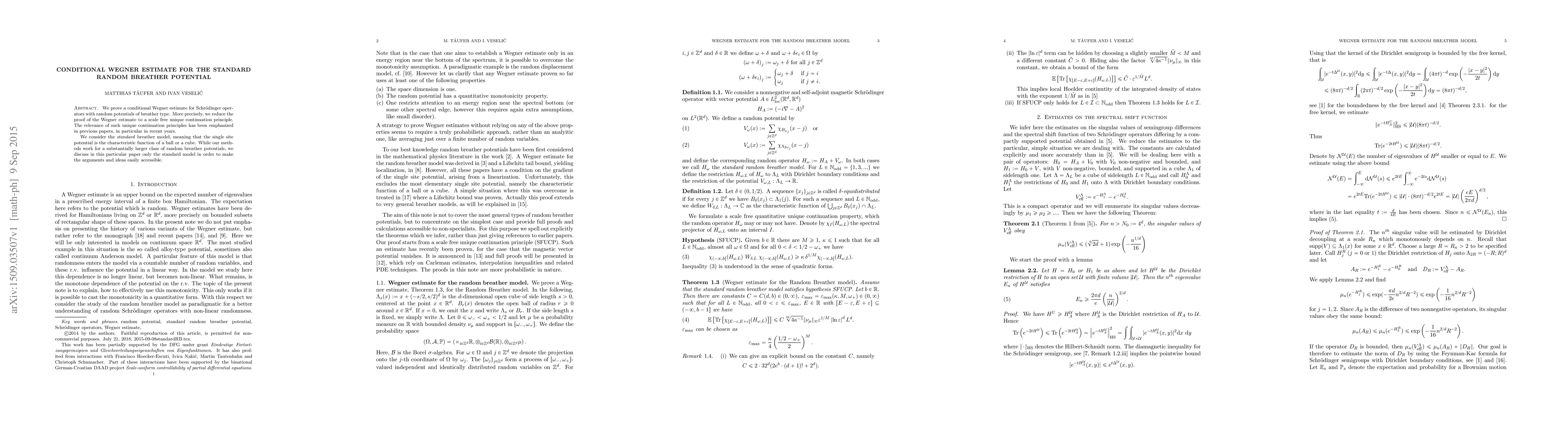 We prove a conditional Wegner estimate for Schr\"odinger operators with random potentials of breather type. More precisely, we reduce the proof of the Wegner estimate to a scale free unique continuation principle. The relevance of such unique continuation principles has been emphasized in previous papers, in particular in recent years. We consider the standard breather model, meaning that the single site potential is the characteristic function of a ball or a cube. While our methods work for a substantially larger class of random breather potentials, we discuss in this particular paper only the standard model in order to make the arguments and ideas easily accessible.