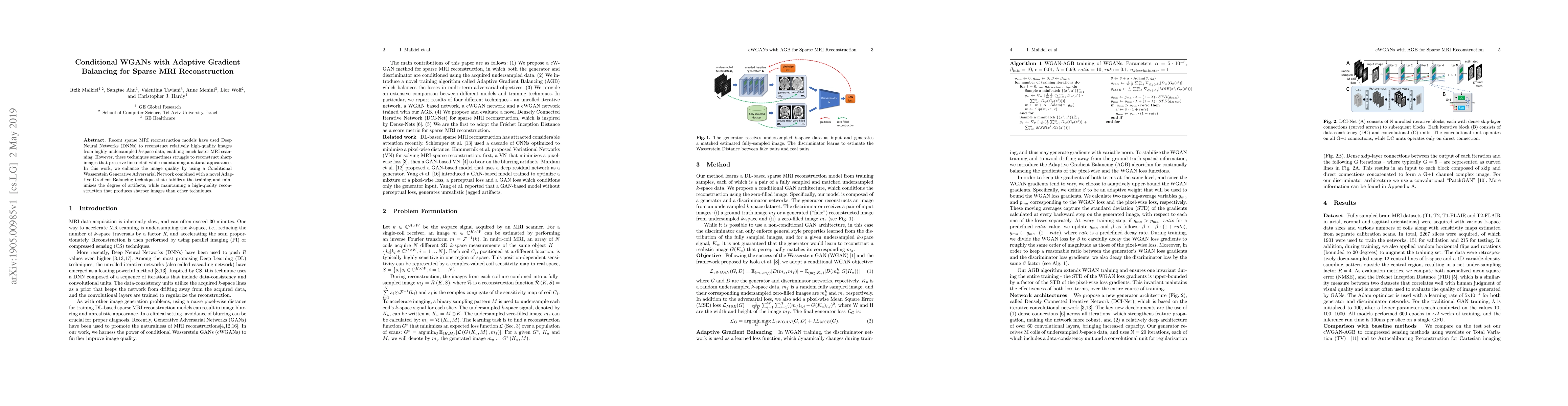 This paper proposes a Conditional Wasserstein Generative Adversarial Network (WGAN) with Adaptive Gradient Balancing for sparse MRI reconstruction, aiming to produce sharper images with fine detail while maintaining natural appearance, addressing the limitations of existing DNN-based techniques. The Adaptive Gradient Balancing technique stabilizes training and minimizes artifacts.
