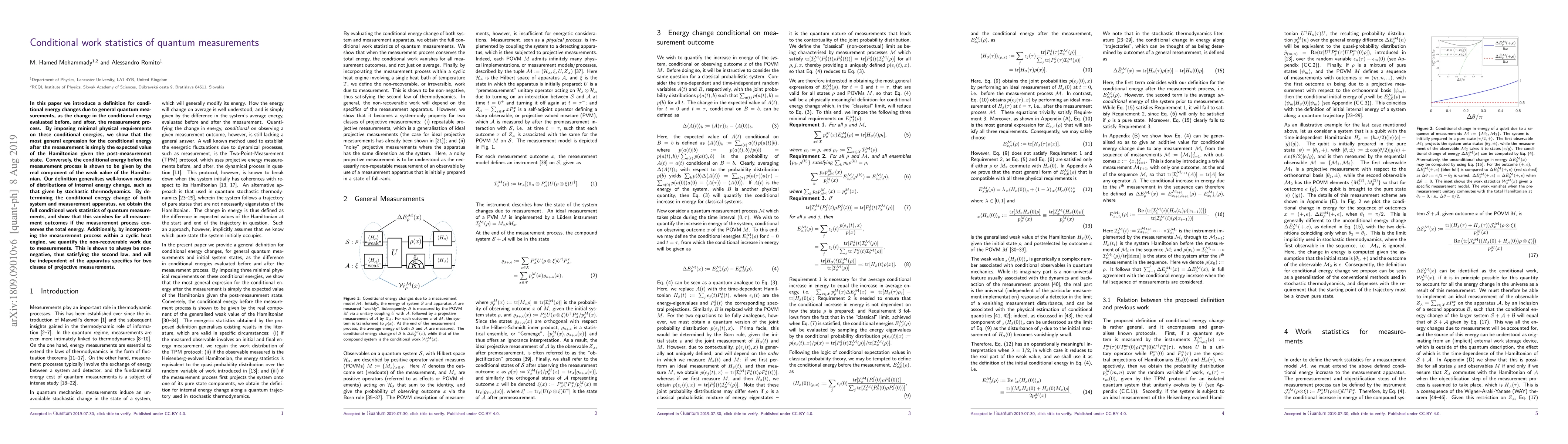 This paper defines conditional energy changes in quantum measurements, showing that the conditional energy post-measurement is the expected value of the Hamiltonian, while the pre-measurement conditional energy is the real component of the Hamiltonian's weak value. It concludes that conditional work statistics vanish if total energy is conserved and quantifies non-recoverable work in cyclic heat engines, which is always non-negative.