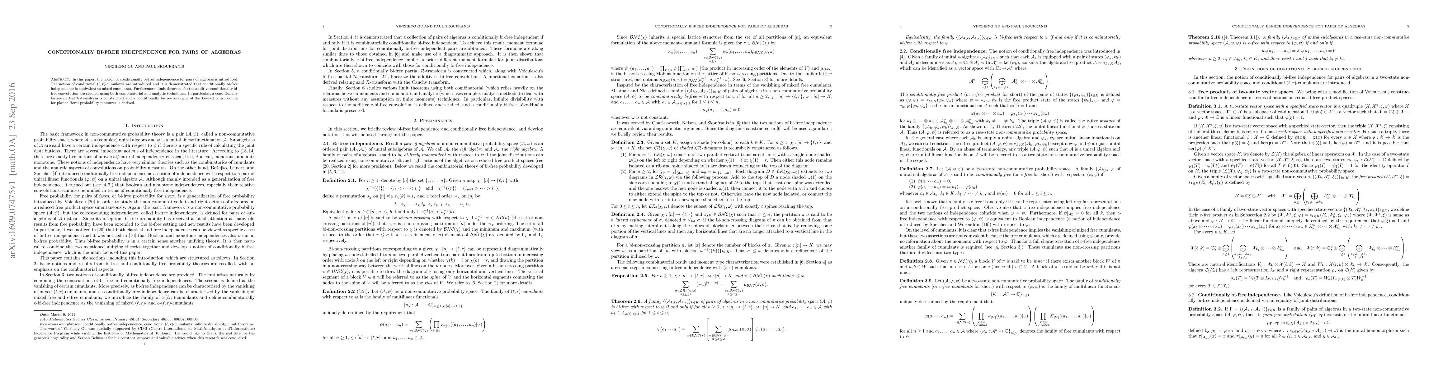 This paper introduces conditionally bi-free independence for pairs of algebras, establishing its equivalence to mixed cumulants via conditional $(\ell, r)$-cumulants. It also explores limit theorems for additive conditionally bi-free convolution, constructing a conditionally bi-free partial $\mathcal{R}$-transform and deriving a bi-free analogue of the Lévy-Hinčin formula.