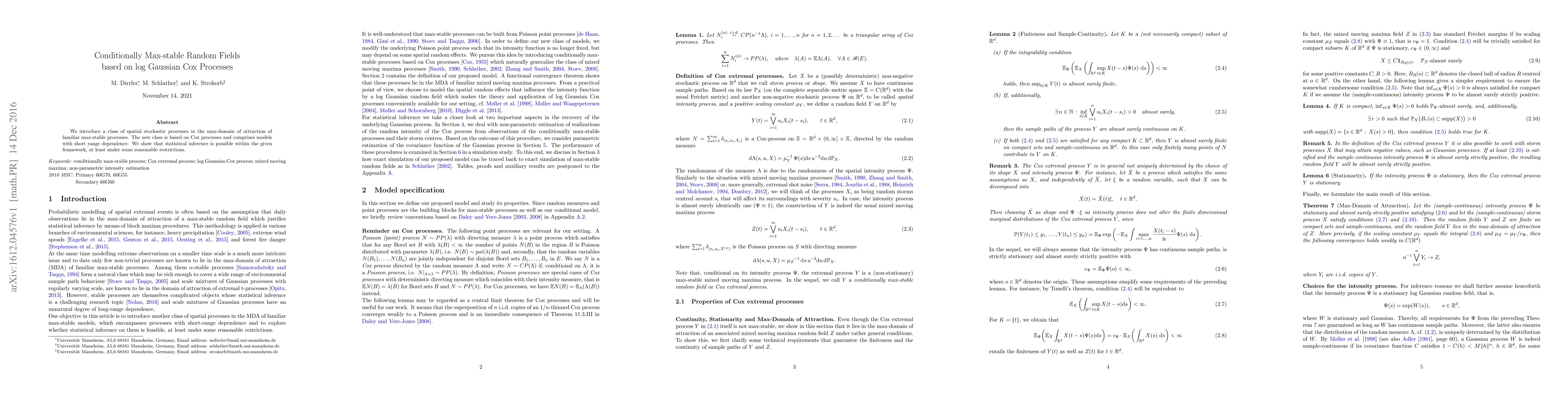 This paper introduces a new class of conditionally max-stable random fields based on log Gaussian Cox processes, featuring short-range dependence. It demonstrates that statistical inference is feasible within this framework under reasonable restrictions.
