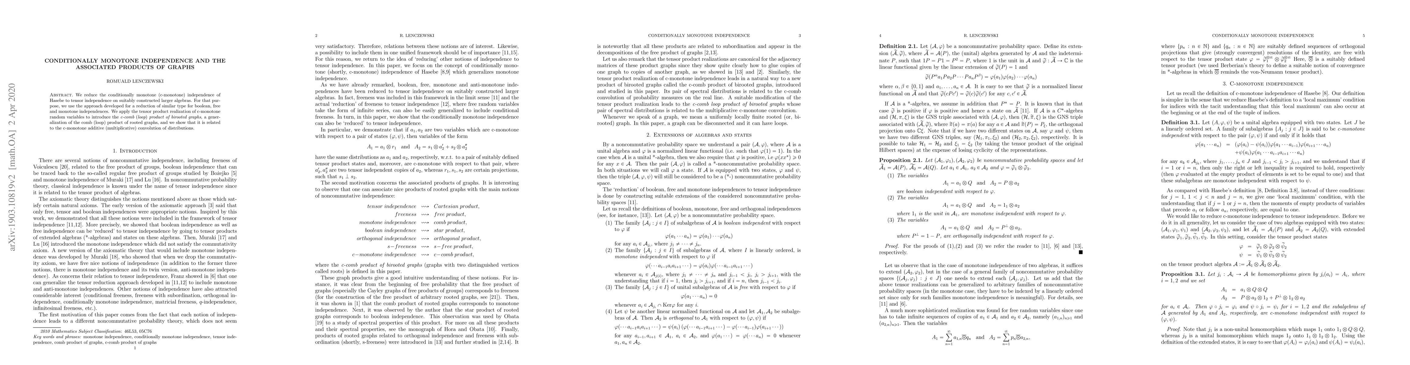 This paper reduces conditionally monotone independence to tensor independence and introduces the c-comb product of birooted graphs as a generalization of the comb product of rooted graphs, showing its relation to the c-monotone additive and multiplicative convolution of distributions.