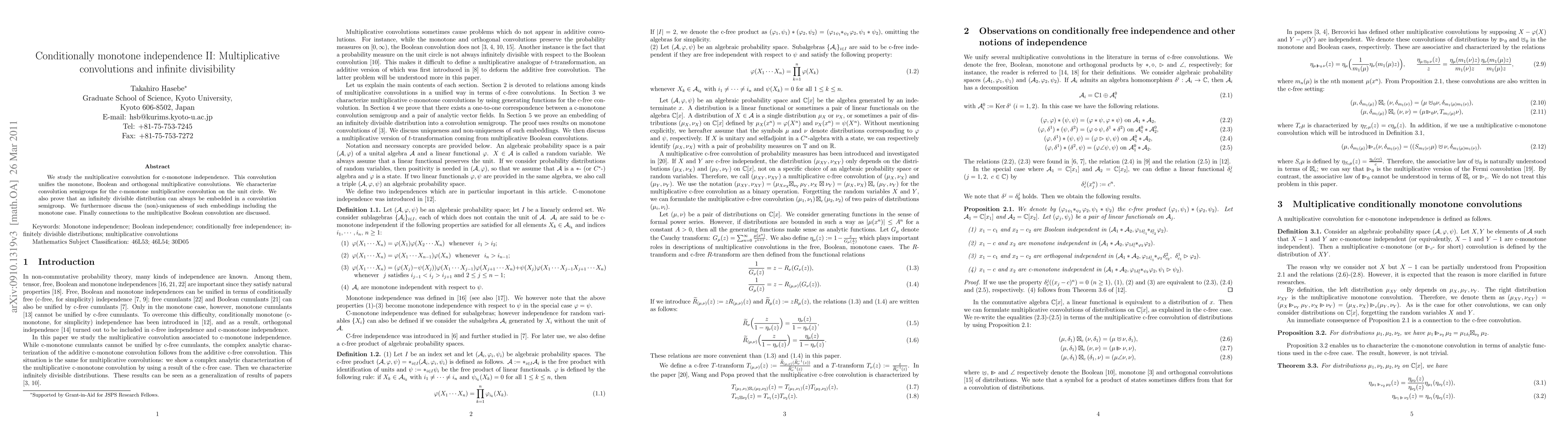 This paper explores the multiplicative convolution for c-monotone independence, unifying various convolution types, and characterizes convolution semigroups on the unit circle. It also proves that infinitely divisible distributions can be embedded in these semigroups, discussing the (non)-uniqueness of such embeddings.