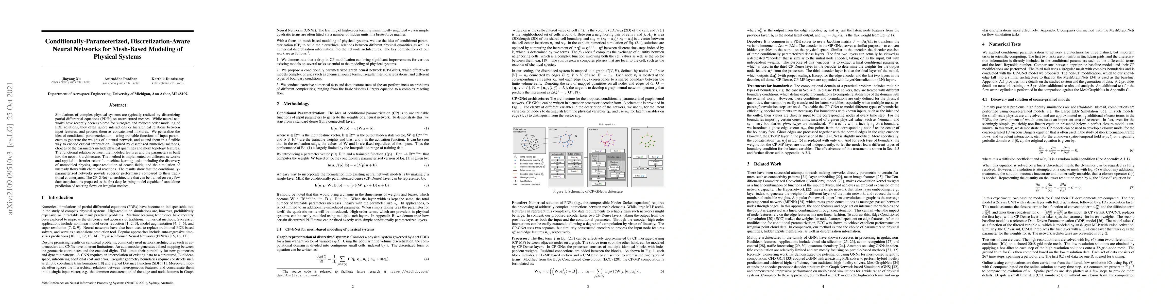 Simulations of complex physical systems are typically realized by discretizing partial differential equations (PDEs) on unstructured meshes. While neural networks have recently been explored for surrogate and reduced order modeling of PDE solutions, they often ignore interactions or hierarchical relations between input features, and process them as concatenated mixtures. We generalize the idea of conditional parameterization -- using trainable functions of input parameters to generate the weights of a neural network, and extend them in a flexible way to encode critical information. Inspired by discretized numerical methods, choices of the parameters include physical quantities and mesh topology features. The functional relation between the modeled features and the parameters is built into the network architecture. The method is implemented on different networks and applied to frontier scientific machine learning tasks including the discovery of unmodeled physics, super-resolution of coarse fields, and the simulation of unsteady flows with chemical reactions. The results show that the conditionally-parameterized networks provide superior performance compared to their traditional counterparts. The CP-GNet - an architecture that can be trained on very few data snapshots - is proposed as the first deep learning model capable of standalone prediction of reacting flows on irregular meshes.