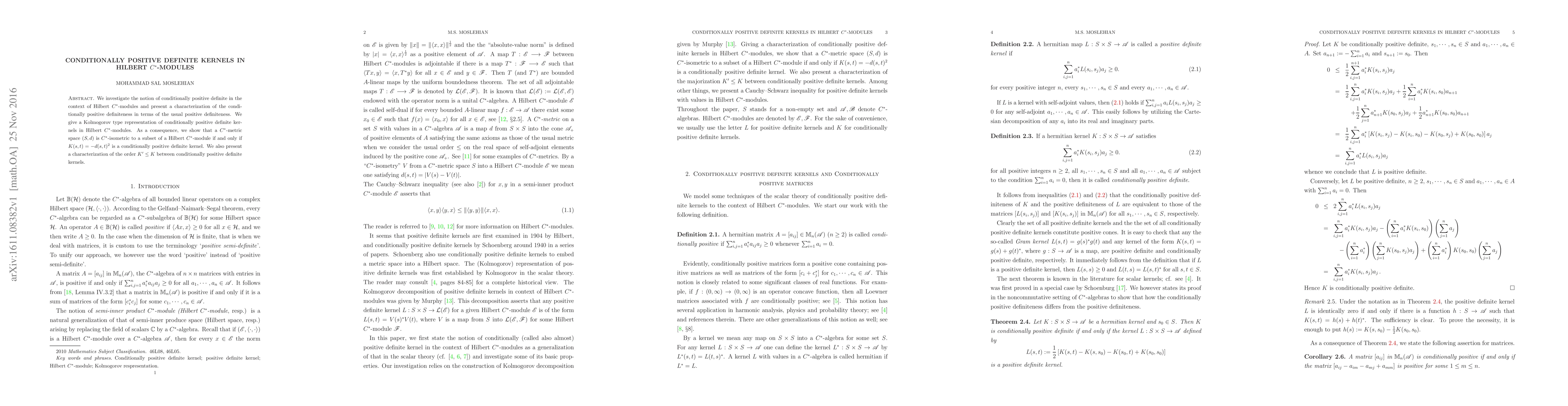 This paper explores the concept of conditionally positive definite kernels within Hilbert $C^*$-modules, providing a characterization linked to usual positive definiteness and a Kolmogorov type representation. It concludes that a $C^*$-metric space is $C^*$-isometric to a Hilbert $C^*$-module if its kernel $K(s,t)=-d(s,t)^2$ is conditionally positive definite, and it characterizes the order relation between such kernels.