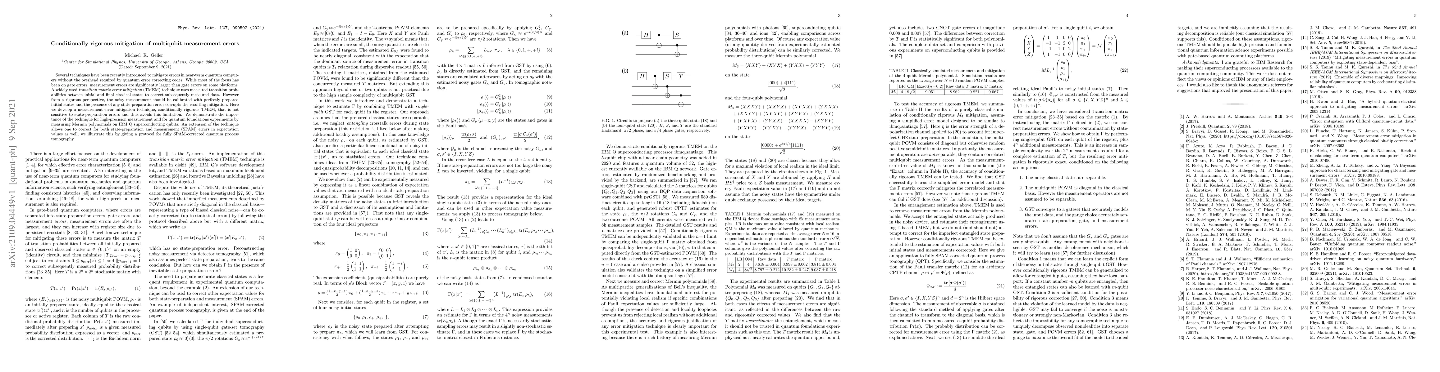 This paper introduces a new error mitigation technique called conditionally rigorous transition matrix error mitigation (TMEM) to correct measurement errors in near-term quantum computers, which is robust against state-preparation errors. The technique is demonstrated through high-precision measurement of Mermin polynomials and a protocol for fully SPAM-corrected quantum process tomography.