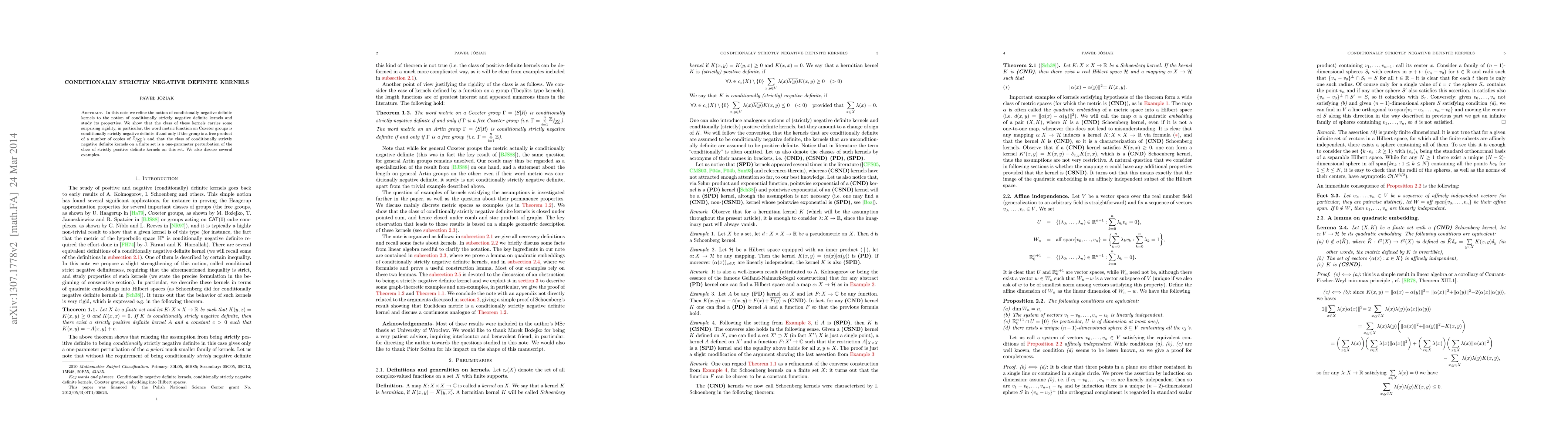 This paper introduces and investigates conditionally strictly negative definite kernels, establishing their rigidity and unique properties. It reveals that the word metric on Coxeter groups exhibits this property only if the group is a free product of copies of $\mathbb{Z}_2$, and discusses the relationship between these kernels and strictly positive definite kernels on finite sets.
