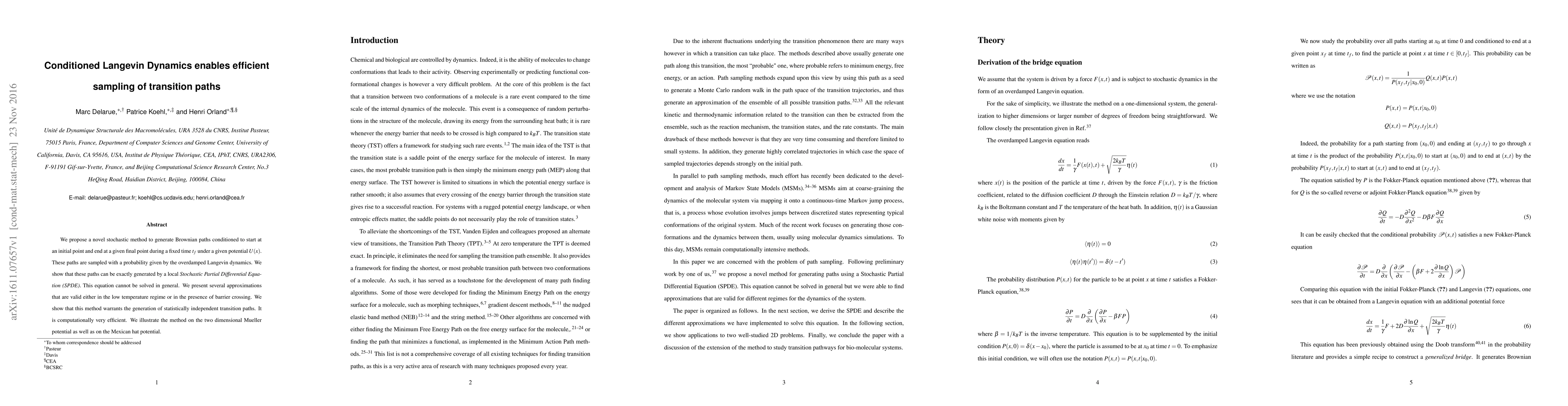 The paper introduces Conditioned Langevin Dynamics for efficient sampling of transition paths between specified initial and final states under a given potential, utilizing a local Stochastic Partial Differential Equation (SPDE) for path generation. The method is computationally efficient and generates statistically independent paths, demonstrated through simulations on the Mueller and Mexican hat potentials.