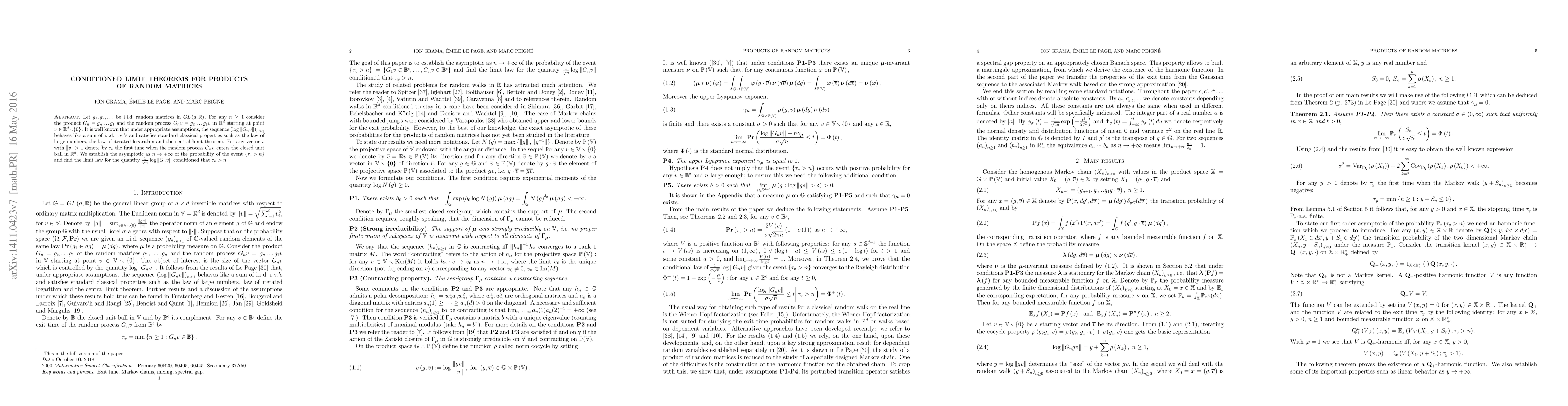 This paper establishes a conditioned limit theorem for products of random matrices, focusing on the probability of exit from a bounded region and the asymptotic behavior of log-normal quantities.