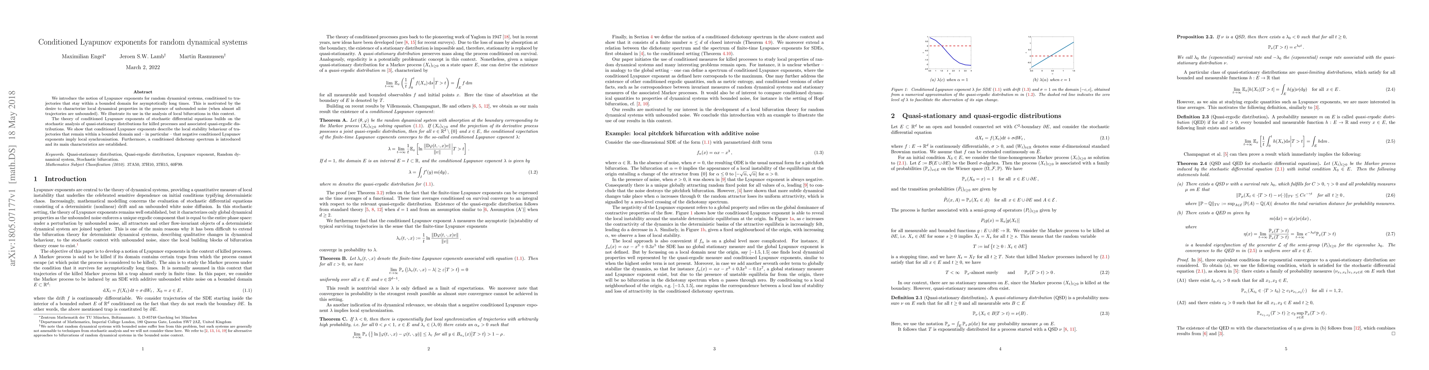We introduce the notion of Lyapunov exponents for random dynamical systems, conditioned to trajectories that stay within a bounded domain for asymptotically long times. This is motivated by the desire to characterize local dynamical properties in the presence of unbounded noise (when almost all trajectories are unbounded). We illustrate its use in the analysis of local bifurcations in this context. The theory of conditioned Lyapunov exponents of stochastic differential equations builds on the stochastic analysis of quasi-stationary distributions for killed processes and associated quasi-ergodic distributions. We show that conditioned Lyapunov exponents describe the local stability behaviour of trajectories that remain within a bounded domain and - in particular - that negative conditioned Lyapunov exponents imply local synchronisation. Furthermore, a conditioned dichotomy spectrum is introduced and its main characteristics are established.