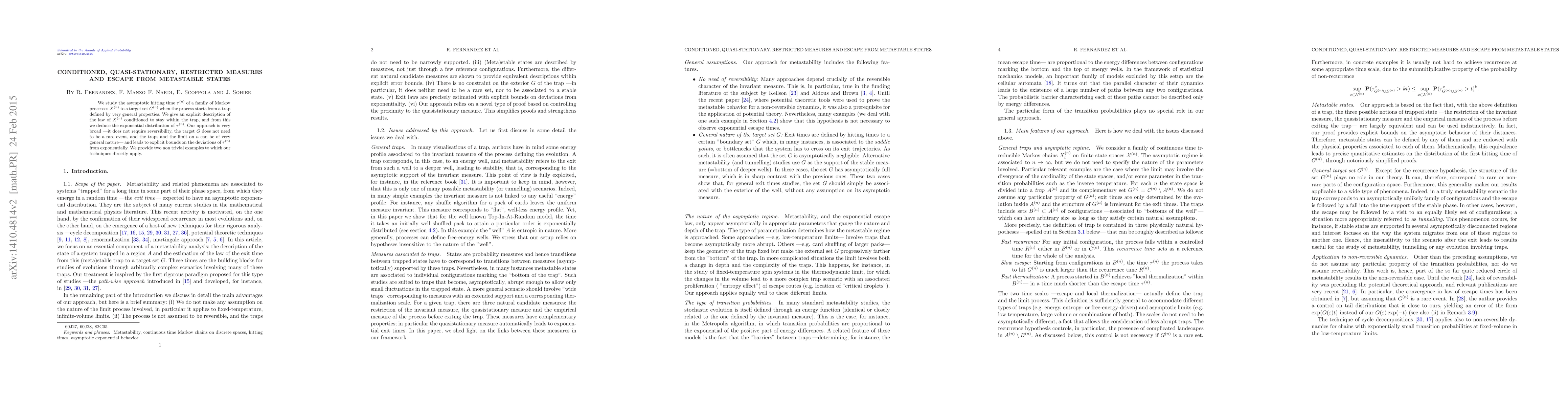 We study the asymptotic hitting time $\tau^{(n)}$ of a family of Markov processes $X^{(n)}$ to a target set $G^{(n)}$ when the process starts from a trap defined by very general properties. We give an explicit description of the law of $X^{(n)}$ conditioned to stay within the trap, and from this we deduce the exponential distribution of $\tau^{(n)}$. Our approach is very broad ---it does not require reversibility, the target $G$ does not need to be a rare event, and the traps and the limit on $n$ can be of very general nature--- and leads to explicit bounds on the deviations of $\tau^{(n)}$ from exponentially. We provide two non trivial examples to which our techniques directly apply.