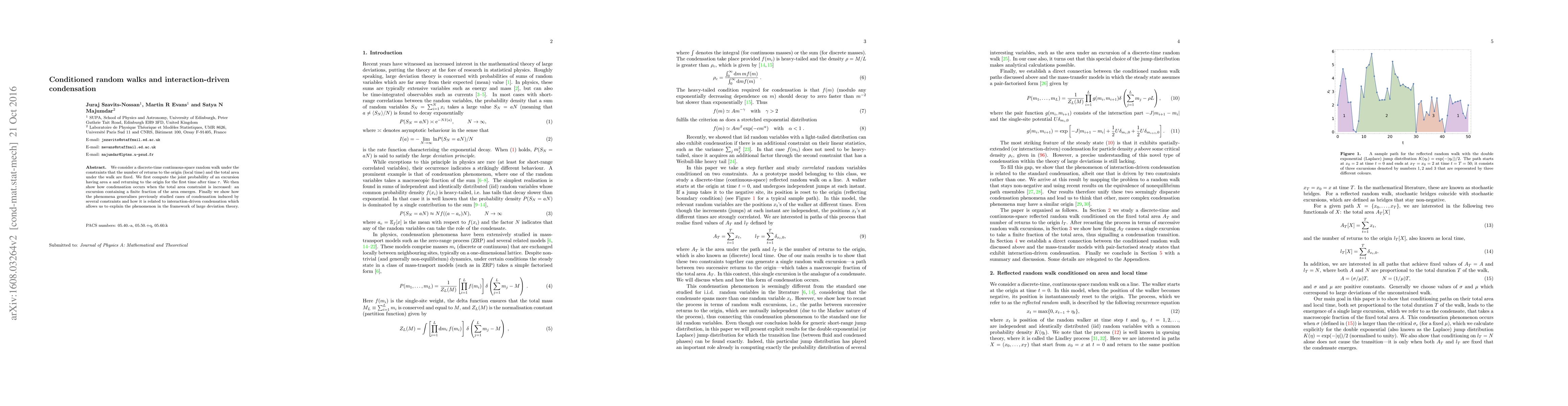 We consider a discrete-time continuous-space random walk under the constraints that the number of returns to the origin (local time) and the total area under the walk are fixed. We first compute the joint probability of an excursion having area $a$ and returning to the origin for the first time after time $\tau$. We then show how condensation occurs when the total area constraint is increased: an excursion containing a finite fraction of the area emerges. Finally we show how the phenomena generalises previously studied cases of condensation induced by several constraints and how it is related to interaction-driven condensation which allows us to explain the phenomenon in the framework of large deviation theory.