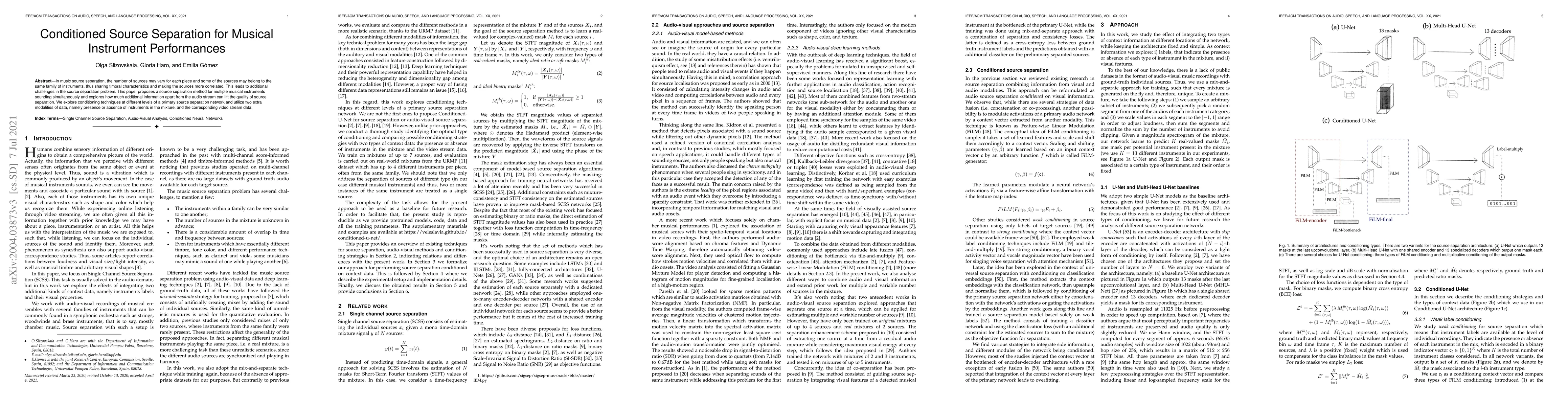 This paper proposes a conditioned source separation method for music with varying sources and correlated instruments, leveraging additional information like instrument presence and video data to enhance separation quality. The approach explores conditioning techniques within a primary separation network to tackle the complexities of simultaneous instrument performances.