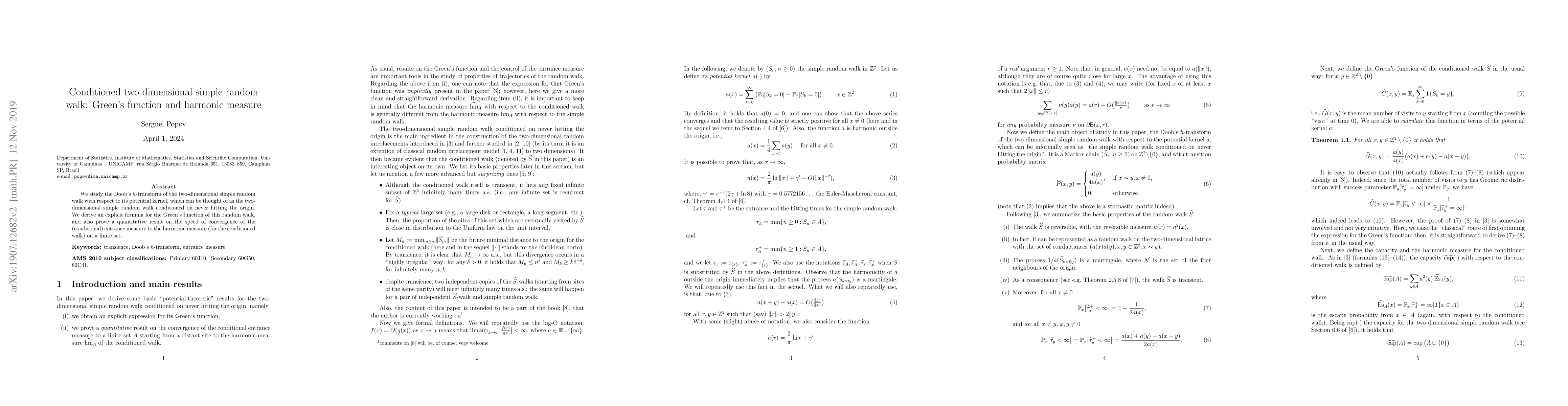 This paper explores the two-dimensional simple random walk conditioned to avoid the origin, deriving an explicit formula for its Green's function and proving the rate at which the conditional entrance measure converges to the harmonic measure on a finite set.
