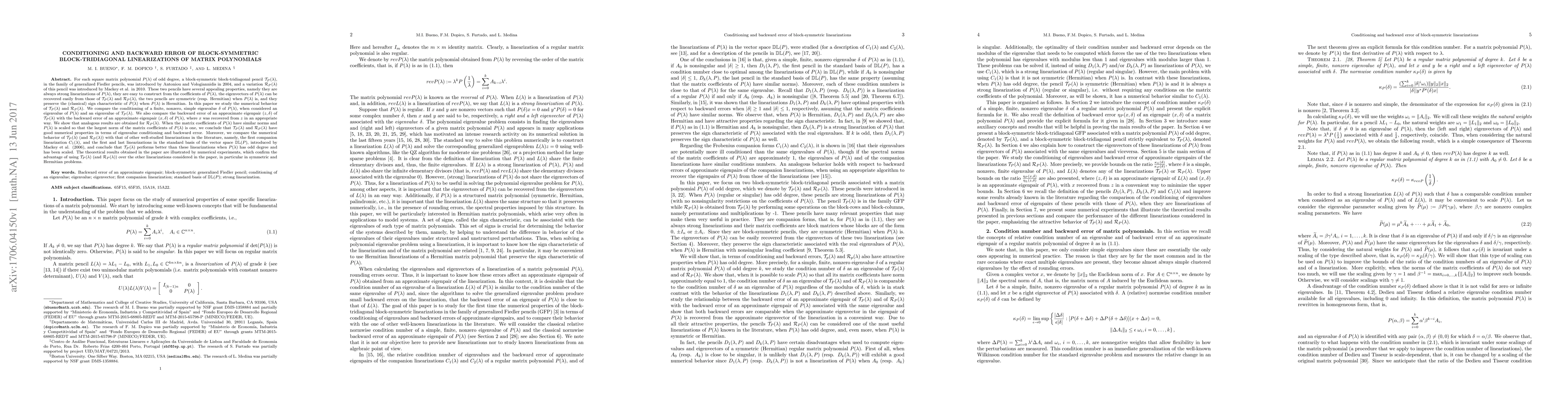For each square matrix polynomial $P(\lambda)$ of odd degree, a block-symmetric block-tridiagonal pencil $\mathcal{T}_{P}(\lambda)$ was introduced by Antoniou and Vologiannidis in 2004, and a variation $\mathcal{R}_P(\lambda)$ was introduced by Mackey et al. in 2010. These two pencils have several appealing properties, namely they are always strong linearizations of $P(\lambda)$, they are easy to construct from the coefficients of $P(\lambda)$, the eigenvectors of $P(\lambda)$ can be recovered easily from those of $\mathcal{T}_P(\lambda)$ and $\mathcal{R}_P(\lambda)$, the two pencils are symmetric (resp. Hermitian) when $P(\lambda)$ is, and they preserve the sign characteristic of $P(\lambda)$ when $P(\lambda)$ is Hermitian. In this paper we study the numerical behavior of $\mathcal{T}_{P}(\lambda)$ and $\mathcal{R}_P(\lambda)$. We compare the conditioning of a finite, nonzero, simple eigenvalue $\delta$ of $P(\lambda)$, when considered an eigenvalue of $P(\lambda)$ and an eigenvalue of $\mathcal{T}_{P}(\lambda)$. We also compare the backward error of an approximate eigenpair $(z,\delta)$ of $\mathcal{T}_{P}(\lambda)$ with the backward error of an approximate eigenpair $(x,\delta)$ of $P(\lambda)$, where $x$ was recovered from $z$ in an appropriate way. When the matrix coefficients of $P(\lambda)$ have similar norms and $P(\lambda)$ is scaled so that the largest norm of the matrix coefficients of $P(\lambda)$ is one, we conclude that $\mathcal{T}_{P}(\lambda)$ and $\mathcal{R}_P(\lambda)$ have good numerical properties in terms of eigenvalue conditioning and backward error. Moreover, we compare the numerical behavior of $\mathcal{T}_{P}(\lambda)$ with that of other well-studied linearizations in the literature, and conclude that $\mathcal{T}_{P}(\lambda)$ performs better than these linearizations when $P(\lambda)$ has odd degree and has been scaled.