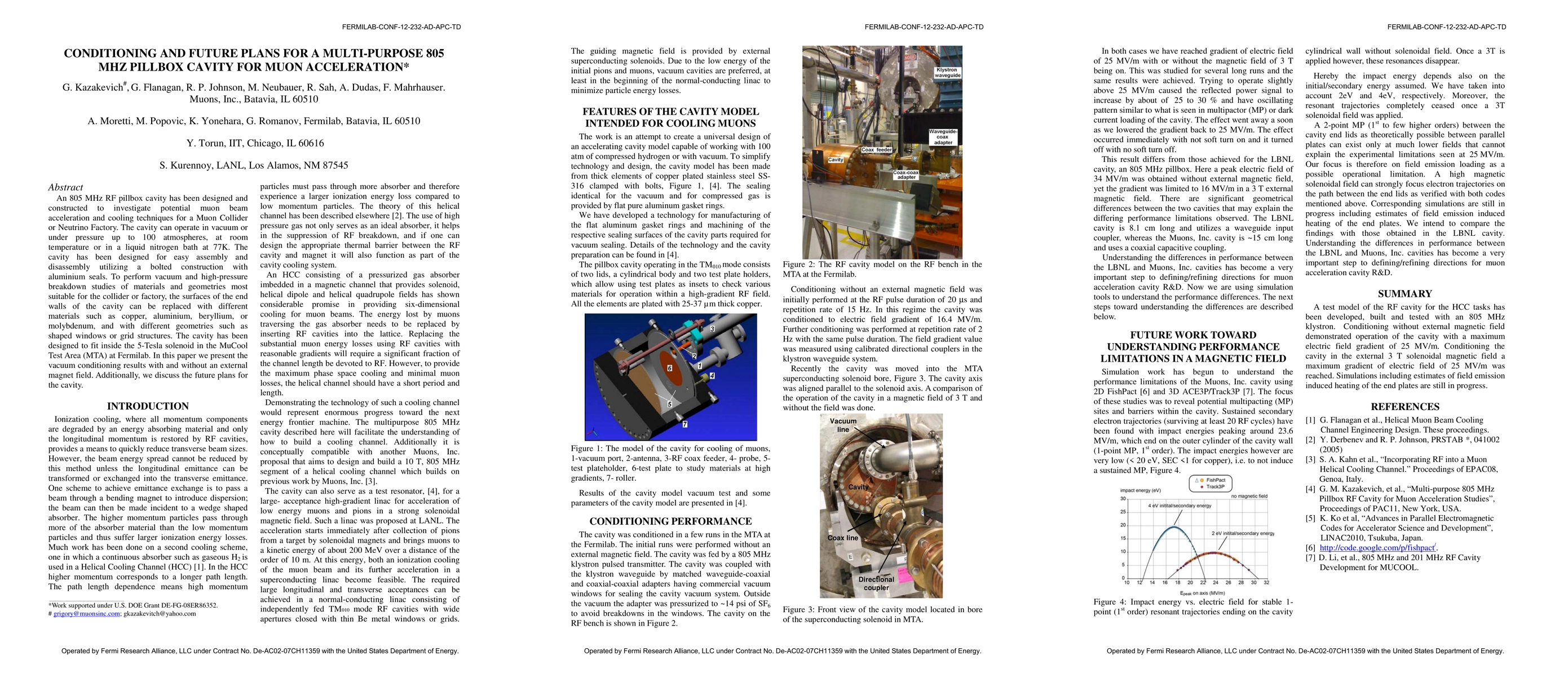An 805 MHz RF pillbox cavity has been designed and constructed to investigate potential muon beam acceleration and cooling techniques for a Muon Collider or Neutrino Factory. The cavity can operate in vacuum or under pressure to 100 atmospheres, at room temperature or in a liquid nitrogen bath at 77 K. The cavity has been designed for easy assembly and disassembly with bolted construction using aluminum seals. To perform vacuum and high pressure breakdown studies of materials and geometries most suitable for the collider or factory, the surfaces of the end walls of the cavity can be replaced with different materials such as copper, aluminum, beryllium, or molybdenum, and with different geometries such as shaped windows or grid structures. The cavity has been designed to fit inside the 5-Tesla solenoid in the MuCool Test Area at Fermilab. In this paper we present the vacuum conditioning results and discuss plans for testing in a 5-Tesla magnetic field. Additionally, we discuss the testing plan for beryllium (a material research has shown to be ideal for the collider or factory) end walls.