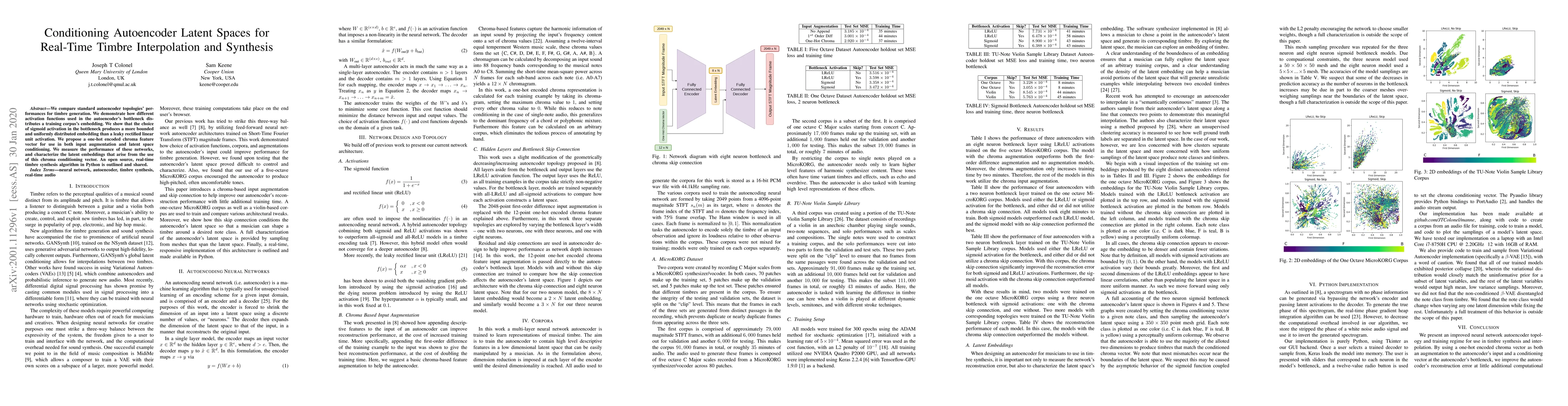 We compare standard autoencoder topologies' performances for timbre generation. We demonstrate how different activation functions used in the autoencoder's bottleneck distributes a training corpus's embedding. We show that the choice of sigmoid activation in the bottleneck produces a more bounded and uniformly distributed embedding than a leaky rectified linear unit activation. We propose a one-hot encoded chroma feature vector for use in both input augmentation and latent space conditioning. We measure the performance of these networks, and characterize the latent embeddings that arise from the use of this chroma conditioning vector. An open source, real-time timbre synthesis algorithm in Python is outlined and shared.