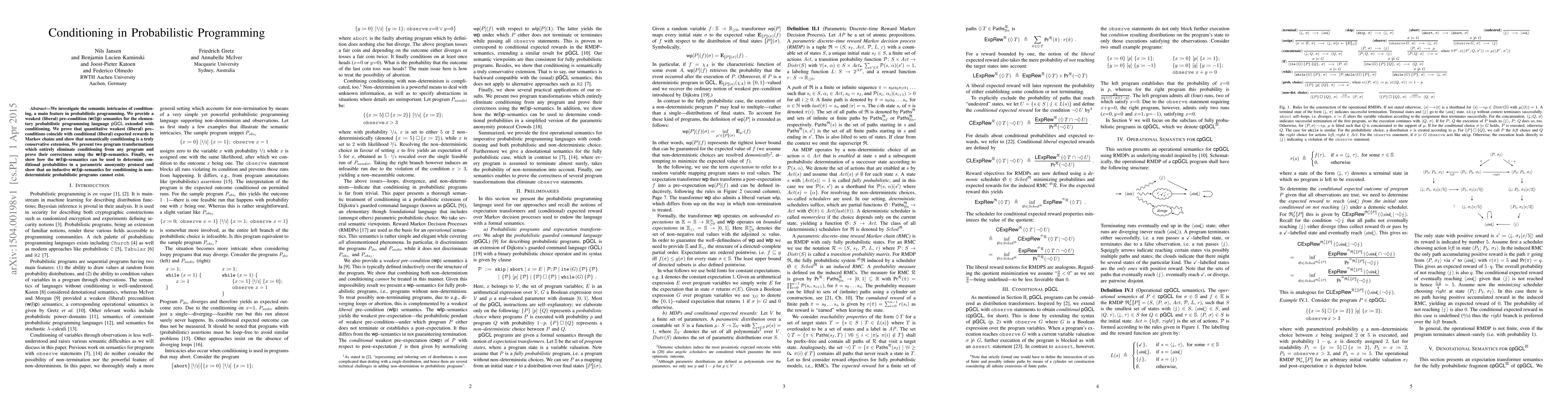 This paper explores the semantics of conditioning in probabilistic programming, introducing a weakest pre-condition semantics for pGCL with conditioning. It demonstrates that conditioning is a conservative extension and presents transformations to eliminate it, while also discussing its application in parametric anonymity protocols.