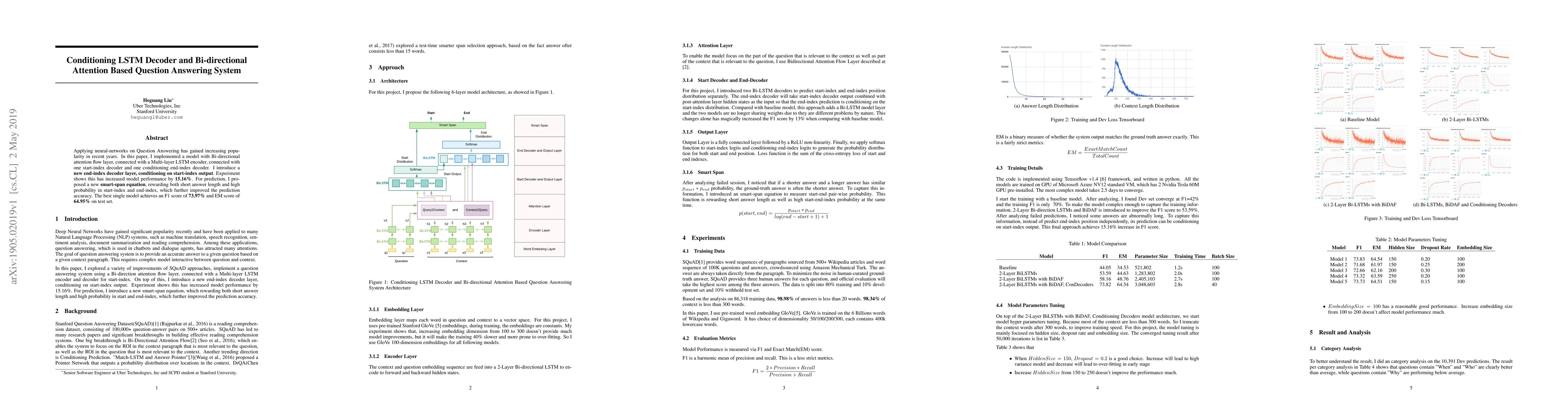 Applying neural-networks on Question Answering has gained increasing popularity in recent years. In this paper, I implemented a model with Bi-directional attention flow layer, connected with a Multi-layer LSTM encoder, connected with one start-index decoder and one conditioning end-index decoder. I introduce a new end-index decoder layer, conditioning on start-index output. The Experiment shows this has increased model performance by 15.16%. For prediction, I proposed a new smart-span equation, rewarding both short answer length and high probability in start-index and end-index, which further improved the prediction accuracy. The best single model achieves an F1 score of 73.97% and EM score of 64.95% on test set.