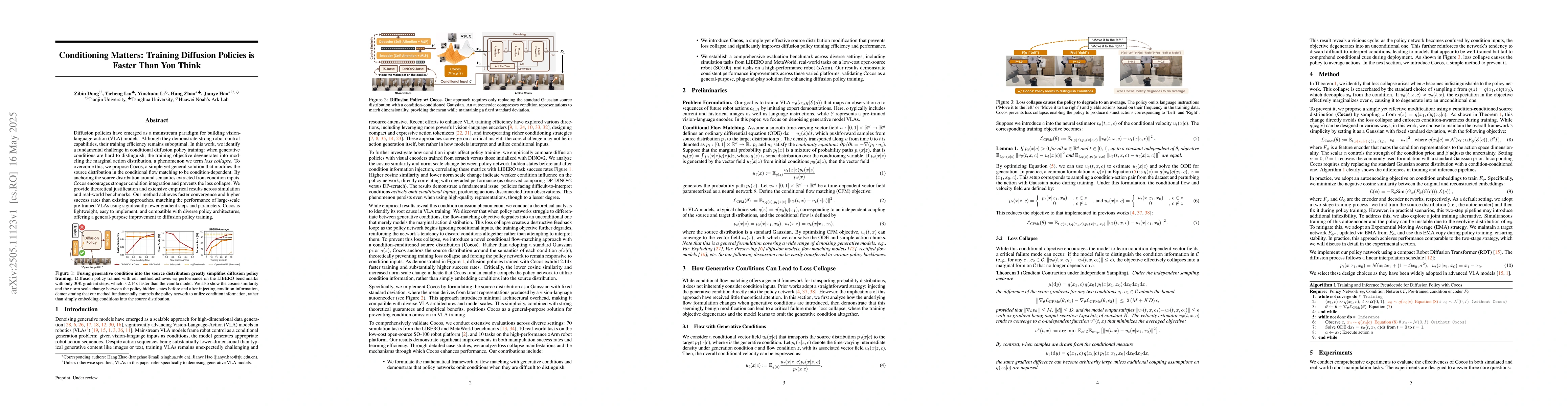 Diffusion policies have emerged as a mainstream paradigm for building vision-language-action (VLA) models. Although they demonstrate strong robot control capabilities, their training efficiency remains suboptimal. In this work, we identify a fundamental challenge in conditional diffusion policy training: when generative conditions are hard to distinguish, the training objective degenerates into modeling the marginal action distribution, a phenomenon we term loss collapse. To overcome this, we propose Cocos, a simple yet general solution that modifies the source distribution in the conditional flow matching to be condition-dependent. By anchoring the source distribution around semantics extracted from condition inputs, Cocos encourages stronger condition integration and prevents the loss collapse. We provide theoretical justification and extensive empirical results across simulation and real-world benchmarks. Our method achieves faster convergence and higher success rates than existing approaches, matching the performance of large-scale pre-trained VLAs using significantly fewer gradient steps and parameters. Cocos is lightweight, easy to implement, and compatible with diverse policy architectures, offering a general-purpose improvement to diffusion policy training.