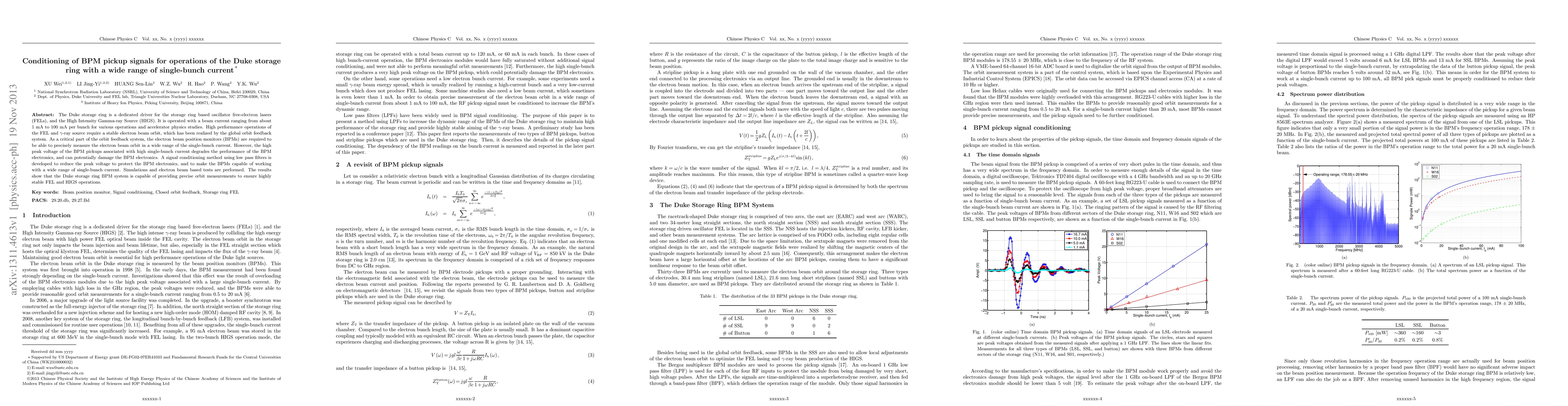 This paper presents a signal conditioning method using low pass filters to reduce peak voltages in BPM pickups, enabling precise orbit measurements across a wide range of single-bunch currents in the Duke storage ring, thus ensuring stable operations for FEL and HIGS. Tests confirm the effectiveness of the method in protecting BPM electronics and maintaining high performance.