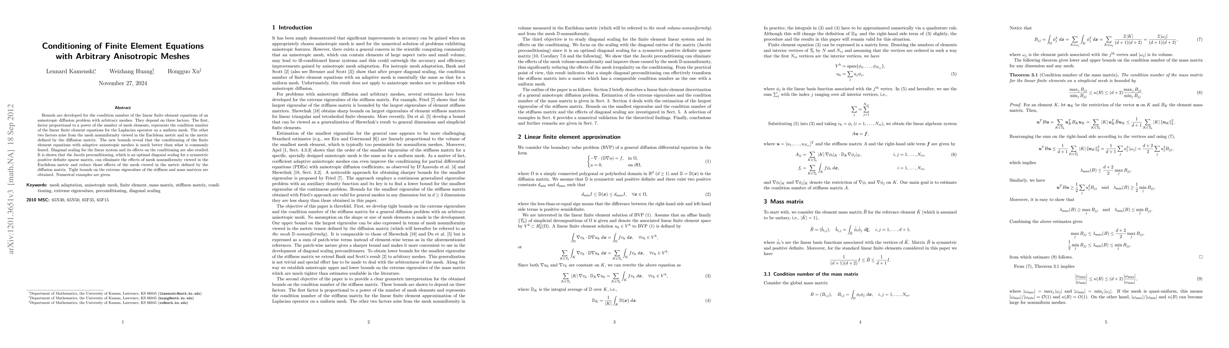 Bounds are developed for the condition number of the linear finite element equations of an anisotropic diffusion problem with arbitrary meshes. They depend on three factors. The first, factor proportional to a power of the number of mesh elements, represents the condition number of the linear finite element equations for the Laplacian operator on a uniform mesh. The other two factors arise from the mesh nonuniformity viewed in the Euclidean metric and in the metric defined by the diffusion matrix. The new bounds reveal that the conditioning of the finite element equations with adaptive anisotropic meshes is much better than what is commonly feared. Diagonal scaling for the linear system and its effects on the conditioning are also studied. It is shown that the Jacobi preconditioning, which is an optimal diagonal scaling for a symmetric positive definite sparse matrix, can eliminate the effects of mesh nonuniformity viewed in the Euclidean metric and reduce those effects of the mesh viewed in the metric defined by the diffusion matrix. Tight bounds on the extreme eigenvalues of the stiffness and mass matrices are obtained. Numerical examples are given.