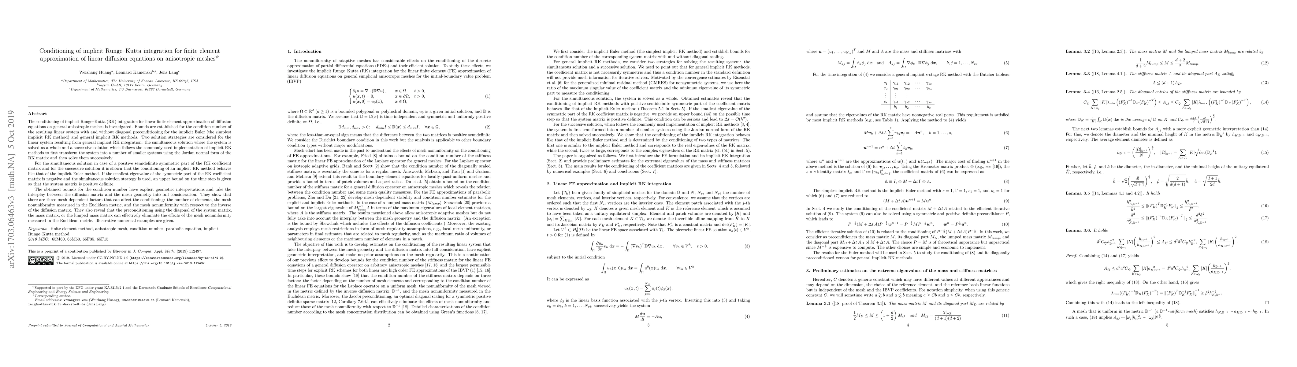 The conditioning of implicit Runge-Kutta (RK) integration for linear finite element approximation of diffusion equations on general anisotropic meshes is investigated. Bounds are established for the condition number of the resulting linear system with and without diagonal preconditioning for the implicit Euler and general implicit RK methods. Two solution strategies are considered for the linear system resulting from general implicit RK integration: the simultaneous solution (the system is solved as a whole) and a successive solution which follows the commonly used implementation of implicit RK methods to first transform the system into smaller systems using the Jordan normal form of the RK matrix and then solve them successively. For the simultaneous solution in case of a positive semidefinite symmetric part of the RK coefficient matrix and for the successive solution it is shown that . If the smallest eigenvalue of the symmetric part of the RK coefficient matrix is negative and the simultaneous solution strategy is used, an upper bound on the time step is given so that the system matrix is positive definite. The obtained bounds for the condition number have explicit geometric interpretations and take the interplay between the diffusion matrix and the mesh geometry into full consideration. They show that there are three mesh-dependent factors that can affect the conditioning: the number of elements, the mesh nonuniformity measured in the Euclidean metric, and the mesh nonuniformity with respect to the inverse of the diffusion matrix. They also reveal that the preconditioning using the diagonal of the system matrix, the mass matrix, or the lumped mass matrix can effectively eliminate the effects of the mesh nonuniformity measured in the Euclidean metric. Numerical examples are given.