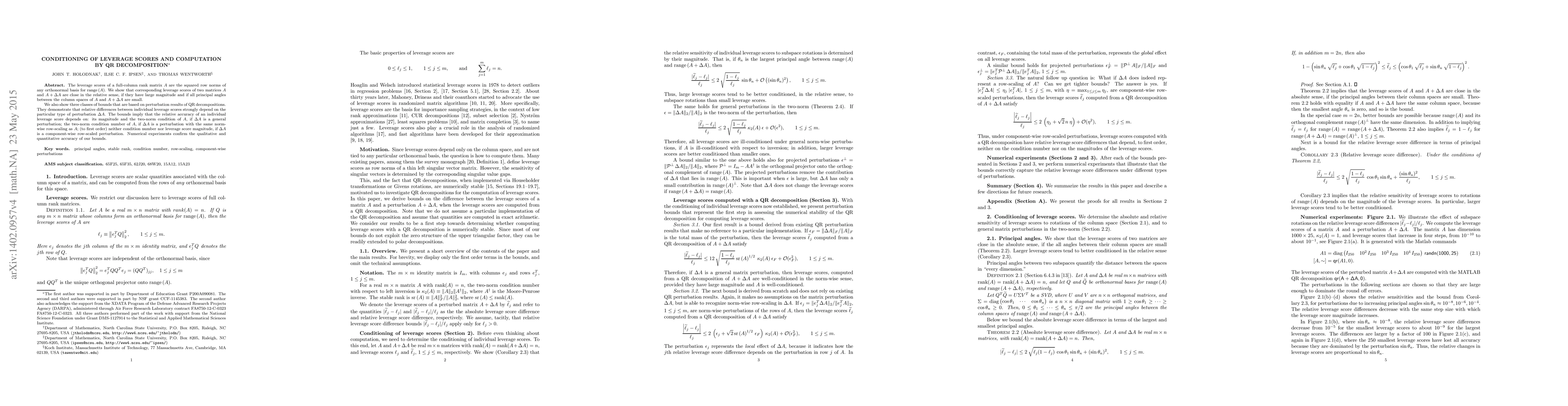 The leverage scores of a full-column rank matrix A are the squared row norms of any orthonormal basis for range(A). We show that corresponding leverage scores of two matrices A and A + \Delta A are close in the relative sense, if they have large magnitude and if all principal angles between the column spaces of A and A + \Delta A are small. We also show three classes of bounds that are based on perturbation results of QR decompositions. They demonstrate that relative differences between individual leverage scores strongly depend on the particular type of perturbation \Delta A. The bounds imply that the relative accuracy of an individual leverage score depends on: its magnitude and the two-norm condition of A, if \Delta A is a general perturbation; the two-norm condition number of A, if \Delta A is a perturbation with the same norm-wise row-scaling as A; (to first order) neither condition number nor leverage score magnitude, if \Delta A is a component-wise row-scaled perturbation. Numerical experiments confirm the qualitative and quantitative accuracy of our bounds.